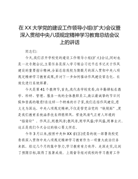 在XX大学党的建设工作领导小组(扩大)会议暨深入贯彻中央八项规定精神学习教育总结会议上的讲话同志们:今天,我们召开学校党的建设工作领导小组(扩大)会议,同时也是一次专题会议,主要任务是深入学习领会习近平总书记关于作风建设的重要指示精神,全面总结我校为期数月的深入贯彻中央八项规定精神学习教育成果,并对下一步如何推动作风建设常态化、长效化进行系统部署。今天是第41个教师节,首先,我代表学校党委,向辛勤耕耘在教学、科研、管理、服务一线的全体教职员工,致以最诚挚的节日问候和崇高的敬意!在这样一个特殊的日子里,我们总结作风建设,意义尤为深远。中央八项规定精神,不仅是管党治党的“铁规矩”,更是我们教育系统涵养优良师德师风、营造风清气正育人环境的“指南针”。作风正,则教风淳;教风淳,则学风盛;学风盛,则事...