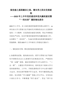 强党建之基固廉洁之堤,履双责之职启发展新程——2025年上半年党的建设和党风廉政建设暨“一岗双责”履职情况报告2025年上半年,在上级党委的坚强领导和悉心指导下,xx单位深入学习贯彻习近平新时代中国特色社会主义思想和党的二十大精神,以党的政治建设为统领,坚定不移推进全面从严治党,扎实开展党的建设和党风廉政建设工作,认真履行“一岗双责”,为XX各项事业高质量发展提供了坚强保障。现将2025年上半年相关工作情况汇报如下:一、强化政治引领,推动党的建设高质量发展1. 加强理论武装,提高政治站位:把学习贯彻习近平新时代中国特色社会主义思想作为首要政治任务,严格落实“第一议题”制度。通过党委理论学习中心组学习、“三会一课”、主题党日等多种形式,组织党员干部深入学习党的创新理论。上半年,开展党委理论学习...