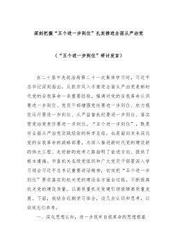 深刻把握“五个进一步到位”扎实推进全面从严治党(“五个进一步到位”研讨发言)在二十届中央政治局第二十一次集体学习时,习近平总书记深刻指出,从抓作风入手推进全面从严治党是新时代党的自我革命一条重要经验,强调对党的自我革命认识要进一步到位、党员干部增强党性要进一步到位、权力规范运行要进一步到位、从严监督执纪要进一步到位、落实管党治党责任要进一步到位。“五个进一步到位”,既是对全面从严治党实践经验的科学总结,也是面向未来深化党的自我革命的战略部署,为深入推进新时代党的建设新的伟大工程、走好新的赶考之路指明了前进方向、提供了根本遵循。市直机关各级党组织和广大党员干部要深入学习领会习近平总书记重要讲话精神,切实把“五个进一步到位”要求落实到机关党的建设各方面全过程,不断提高机关党的建设质量,以高质量机...