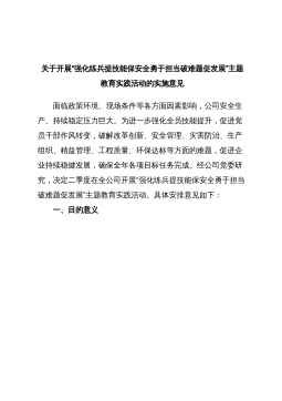 关于开展“强化练兵提技能保安全勇于担当破难题促发展”主题教育实践活动的实施意见面临政策环境、现场条件等各方面因素影响,公司安全生产、持续稳定压力巨大。为进一步强化全员技能提升,促进党员干部作风转变,破解改革创新、安全管理、灾害防治、生产组织、精益管理、工程质量、环保达标等方面的难题,促进企业持续稳健发展,确保全年各项目标任务完成。经公司党委研究,决定二季度在全公司开展“强化练兵提技能保安全勇于担当破难题促发展”主题教育实践活动。具体安排意见如下:一、目的意义今年以来,面对诸多困难挑战,公司上下紧紧围绕“聚力攻坚年”主题主线,有效凝聚了全员直面挑战、推进改革、创新发展的强大合力,确保了首季“开门...
