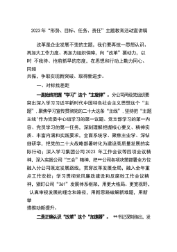 2023年“形势、目标、任务、责任”主题教育活动宣讲稿改革是企业发展不变的主题,我们要再统一思想认识、再加大工作力度、再加力组织保障,向“改革”要动力,以时不我待、抢前抓早的态度,在思想和行动上勤力同心、同频共振,争取实现新突破、取得新进步。一、对标找差距一是始终把握“学习”这个“主旋律”。分公司两级党组织要突出深入学习习近平新时代中国特色社会主义思想这个“主题”,聚焦学习宣传贯彻党的二十大这条“主线”,坚持把“主题主线"作为党委中心组学习的第一议题、党支部学习的第一内容、党员学习的第一任务,深刻理解把握核心要义、精神实质、丰富内涵和实践要求,全面系统学、聚焦主业学、深钻细研学,把党的二十大战...