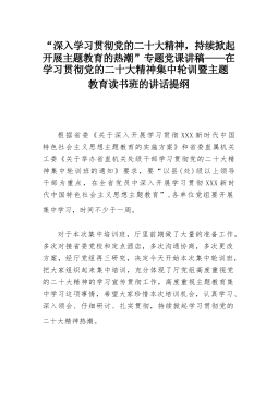 “深入学习贯彻党的二十大精神,持续掀起开展主题教育的热潮”专题党课讲稿——在学习贯彻党的二十大精神集中轮训暨主题教育读书班的讲话提纲根据省委《关于深入开展学习贯彻XXX新时代中国特色社会主义思想主题教育的实施方案》和省委直属机关工委《关于举办省直机关处级干部学习贯彻党的二十大精神集中轮训班的通知》要求,要“以县(处)级以上领导干部为重点,在全省党员中深入开展学习贯彻XXX新时代中国特色社会主义思想主题教育”,各单位党组要开展集中学习,时间不少于一周。对于本次集中培训班,厅里前期做了大量的准备工作,多次对接省委党校和定点酒店,多次沟通协商,多次更改方案,经厅党组再三研究,决定今天开始本次集中轮训...