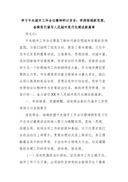 学习中央城市工作会议精神研讨发言:学深悟透新思想,奋楫笃行谱写人民城市现代化建设新篇章同志们:中央城市工作会议擘画了新时代新征程城市发展的宏伟蓝图,为我们指明了前进方向、提供了根本遵循。习近平总书记发表的重要讲话,立意高远、思想深邃、内涵丰富,深刻洞察城市发展规律,科学回应时代课题,是做好当前和今后一个时期城市工作的纲领性文献。作为城市建设管理的主力军,市住建局肩负着光荣使命与重大责任。我们必须以高度的政治自觉、思想自觉和行动自觉,将学习宣传贯彻会议精神作为首要政治任务,做到学思用贯通、知信行统一,奋力谱写XX市人民城市现代化建设新篇章。一、学深悟透、把握精髓,深刻领会新时代城市工作思想伟力与实践要求深刻领会、准确把握中央城市工作会议精神特别是习近平总书记重要讲话的核心要义与精髓实质,是统一...