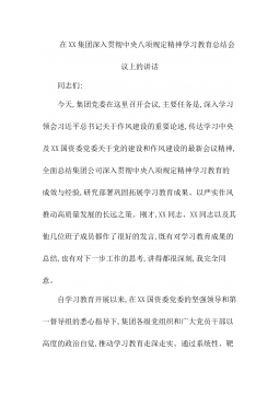 在XX集团深入贯彻中央八项规定精神学习教育总结会议上的讲话同志们:今天,集团党委在这里召开会议,主要任务是,深入学习领会习近平总书记关于作风建设的重要论述,传达学习中央及XX国资委党委关于党的建设和作风建设的最新会议精神,全面总结集团公司深入贯彻中央八项规定精神学习教育的成效与经验,研究部署巩固拓展学习教育成果、以严实作风推动高质量发展的长远之策。刚才,XX同志、XX同志以及其他几位班子成员都作了很好的发言,既有对学习教育成果的总结,也有对下一步工作的思考,讲得都很深刻,我完全同意。自学习教育开展以来,在XX国资委党委的坚强领导和第一督导组的悉心指导下,集团各级党组织和广大党员干部以高度的政治自觉,推动学习教育走深走实。通过系统性、靶向性、常态化的学习与实践,集团上下思想认识得到新提升,严的...