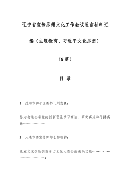 辽宁省宣传思想文化工作会议发言材料汇编(主题教育、习近平文化思想)(8篇)目录1.沈阳市和平区委书记刘志寰:努力打造全省党的创新理论学习高地、研究高地和传播高地………………12.大连市委宣传部部长郭铁钧:激发文化创新创造活力汇聚大连全面振兴动能………………………………33.盘锦市委宣传部部长李群:加快建设全域全面城乡一体内外兼修的全国文明城市………………………44.省委网信办主任唐宋:切实讲好辽宁打造新时代“六地”推动全面振兴新突破的故事……………55.辽宁报刊传媒集团(辽宁日报社)社长丁宗皓:坚决把习近平文化思想贯彻到新闻舆论工作的各方面和全过程……………66.辽宁广播电视集团(辽宁广播电视...