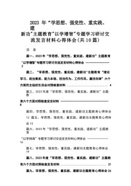 2023年“学思想、强党性、重实践、建新功"主题教育"以学增智"专题学习研讨交流发言材料心得体会(共10篇)目录篇一、2023年“学思想、强党性、重实践、建新功”主题教育"以学增智"专题学习研讨交流发言材料心得体会……………………2篇二、“学思想、强党性、重实践、建新功"主题教育“理论学习、政治素质、能力本领、担当作为、工作作风、廉洁自律”六个方面民主组织生活会对照检查材料..........................4篇三、2023年度“学思想、强党性、重实践、建新功”主题教育六个方面对照检查发言材料…………………………………………8篇四、学思想、强党性、重实践、建新功主题教育心得体会...