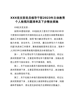 XXX党支部党员领导干部2023年主体教育个人检视问题清单及下步整改措施XX机关党支部:按照XX委组织部、XX直机关工委关于开展2023年学习贯彻XXX新时代中国特色社会主义思想主体教育检视问题的工作安排部署。按照“着力解决理论学习、政治素质、能力本领、担当作为、工作作风、廉洁自律等六个方面的问题”的具体工作要求,聚焦职能职责和主责主业,现将个人2023年主体教育检视问题情况分析报告如下。第一,关于在理论学习方面的检视问题情况。经过认真对照查摆下来,主要是有理论学习重视不够,没能从思想上把学习放在首位,学习不够系统、规范。第二,关于在政治素质方面的检视问题情况。经过认真对照查摆下来,主要是贯彻...