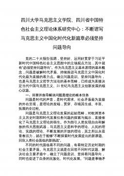 四川大学马克思主义学院、四川省中国特色社会主义理论体系研究中心:不断谱写马克思主义中国化时代化新篇章必须坚持问题导向党的二十大报告强调,坚持好、运用好贯穿于习近平新时代中国特色社会主义思想中的立场观点方法,其中就有“必须坚持问题导向”。作为马克思主义基本原理的基本概念,问题是破解时代矛盾、持续推进马克思主义中国化时代化最为直接的着力点。确立问题意识、坚持问题导向,也是马克思主义哲学方法论的基本范畴,已经成为直接决定当代中国马克思主义、21世纪马克思主义创新发展的核心议题。一、回答并指导解决问题是理论的根本任务问题是时代的声音,是时代需求、社会矛盾最为直接的外在呈现,是理论的发端,贯穿、存续其生...