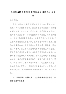 在县政府党组意识形态工作专题会议上的讲话同志们:今天,我们召开县政府党组意识形态工作专题会议,主要任务是深入学习贯彻习近平总书记关于意识形态工作的重要论述,分析当前我县政府系统意识形态领域面临的形势,研究部署下一阶段的重点工作。意识形态工作是为国家立心为民族立魂的工作,是一项极端重要的工作。在当前这个机遇与挑战并存、发展与风险交织的关键时期,我们必须以“时时放心不下”的责任感,将这项工作抓在手上、扛在肩上、落实到行动上,为全县经济社会高质量发展提供坚强的思想保证和强大的精神力量。下面,我讲三点意见。一、提高政治站位,深刻认识意识形态工作的极端重要性,坚决扛起政治责任思想是行动的先导。意识形态工作,本质上做的是政治工作、人心工作,事关党的前途命运,事关国家长治久安,事关民族凝聚力和向心力。习近...