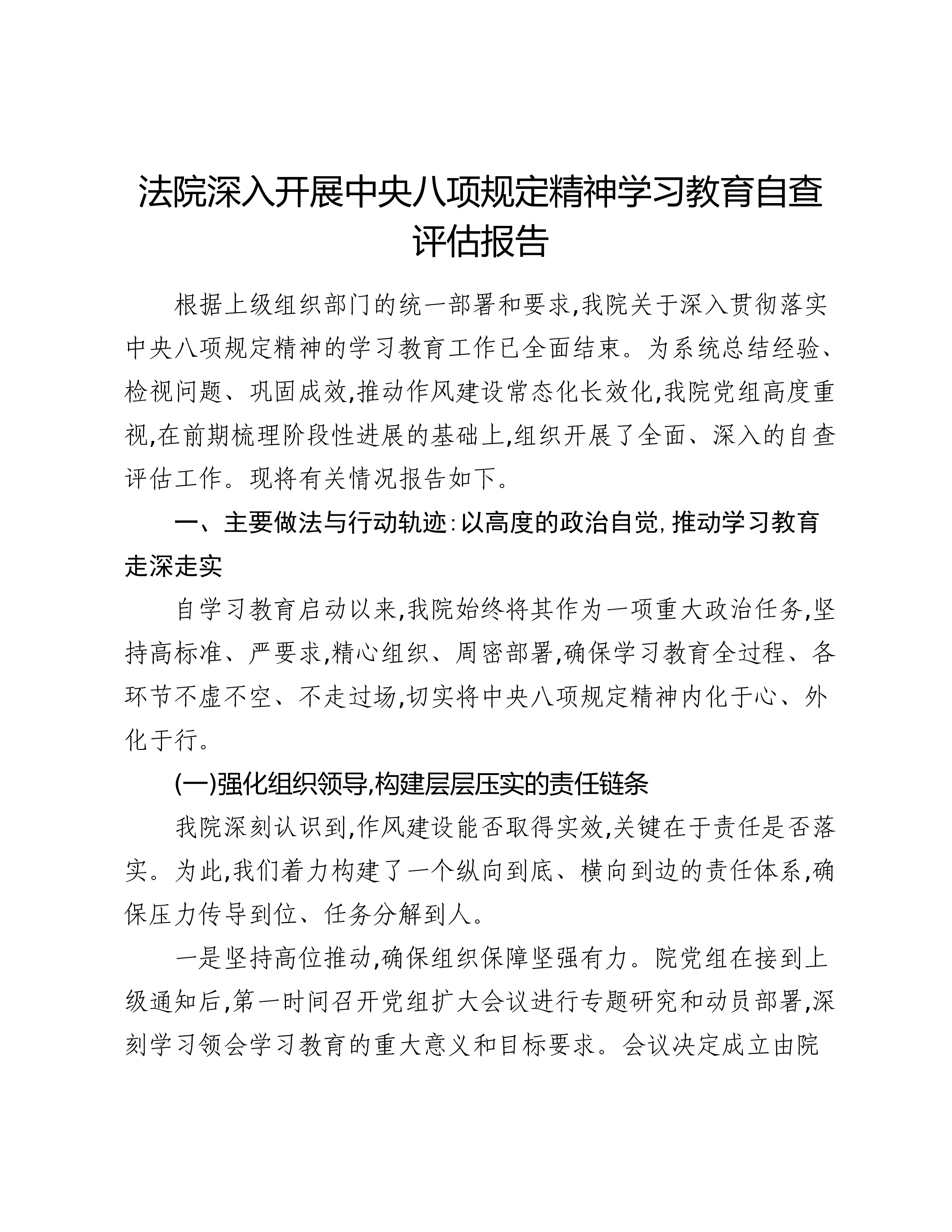 法院深入开展中央八项规定精神学习教育自查评估报告根据上级组织部门的统一部署和要求,我院关于深入贯彻落实中央八项规定精神的学习教育工作已全面结束。为系统总结经验、检视问题、巩固成效,推动作风建设常态化长效化,我院党组高度重视,在前期梳理阶段性进展的基础上,组织开展了全面、深入的自查评估工作。现将有关情况报告如下。一、主要做法与行动轨迹:以高度的政治自觉,推动学习教育走深走实自学习教育启动以来,我院始终将其作为一项重大政治任务,坚持高标准、严要求,精心组织、周密部署,确保学习教育全过程、各环节不虚不空、不走过场,切实将中央八项规定精神内化于心、外化于行。(一)强化组织领导,构建层层压实的责任链条我院深刻认识到,作风建设能否取得实效,关键在于责任是否落实。为此,我们着力构建了一个纵向到底、横向到边...
