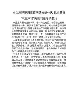 市生态环境局查摆问题改进作风 扎实开展“六重六轻”突出问题专项整治一是提高理论业务水平。学习传达省委、市委会议精神,明确目标任务、整治重点和工作举措,对全市生态环境系统“六重六轻”突出问题专项整治工作进行专题部署。持续深入学习贯彻落实党的贰拾DA精神,以党的理论武装头脑,坚持学思用贯通、知信行统一,进一步鼓舞和激励全市生态环境系统心往一处想、劲往一处使,在全省争先进位。二是推进活动有力有序有效开展。扎实开展“六重六轻”突出问题专项整治,带头查摆问题、改进作风。坚持“以案为鉴、以案促改”,用“身边案”教育好“身边人”,促进生态环境保护工作提质增效,形成廉洁清正、争先创优的良好氛围为广大百姓提供环...