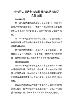对领导人员进行谈话提醒和诫勉谈话的实施细则第一章总则第一条为规范谈话提醒和诫勉谈话等工作,根据《中国共产党党内监督条例》《中国共产党纪律检查机关监督执纪工作规则》等党内法规,结合学校实际,制定本细则。 第二条学校纪委按照干部管理权限,对学校管理的正副处级领导人员及参照处级领导人员管理的人员进行谈话提醒和诫勉谈话。 第三条坚持惩前毖后、治病救人;坚持抓早抓小、防微杜渐;坚持依规依纪、实事求是;坚持严管和厚爱结合,激励和约束并重,精准有效运用监督执纪“四种形态”。 第二章谈话提醒第四条学校纪委在对领导人员日常监督检查工作中或者通过信访举报、巡视巡察、内控审计及其他途径发现领导人员的苗头性、倾向性问...