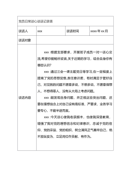 党员日常谈心谈话记录表谈话人xxx谈话时间xxxx年xx月谈话对象谈话内容xxx:根据支部要求,开展班子成员一对一谈心交流,希望你能畅所欲言,关于近期的学习,结合自身你有哪些认识?xxx:通过三会一课主题党日等学习,在一定程度上提高了党的思想觉悟,责任意识差,有时满足于管好自己,对见到的问题不愿意多说,不想多说,不愿意得罪人,不想得罪人,没有从大局上考虑问题。xxx:能发现自身问题,并正视这些突出问题,还要在理想信念上对自己设有高标准、严要求,业务学习要专心,不能半途而废。xxx:今天谈心使我收获颇丰,也使我深受教育,增强了我对党的理想信念和纪律意识,忠诚于党的信仰、党的宗旨、党的组织,树立清...