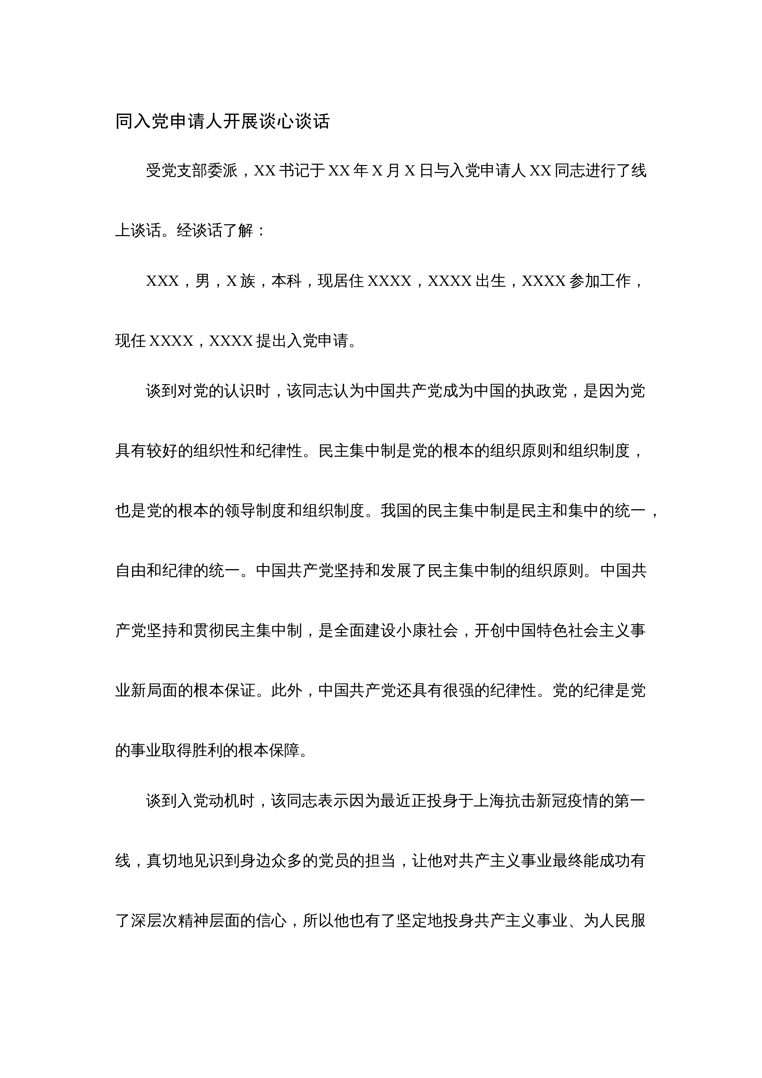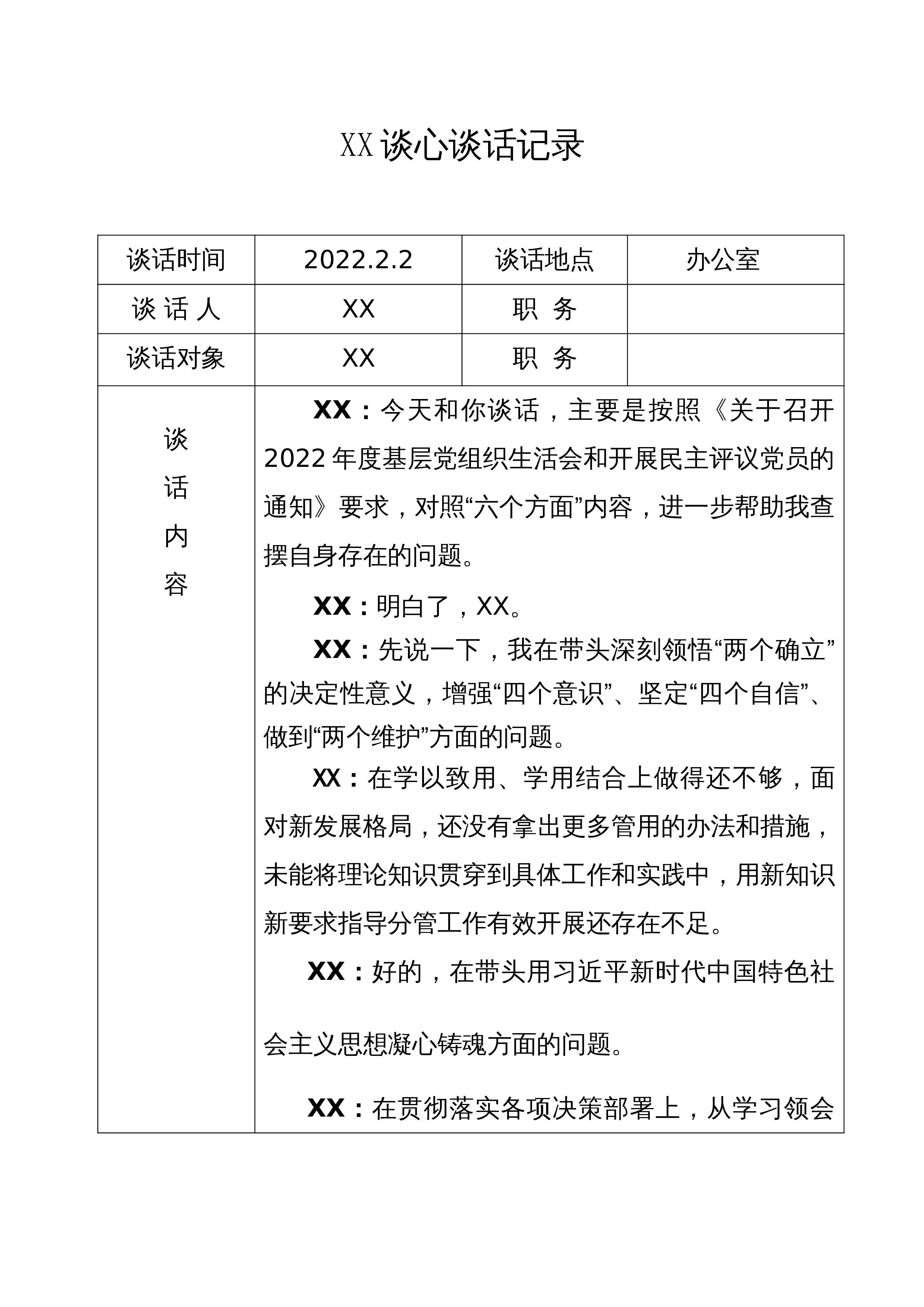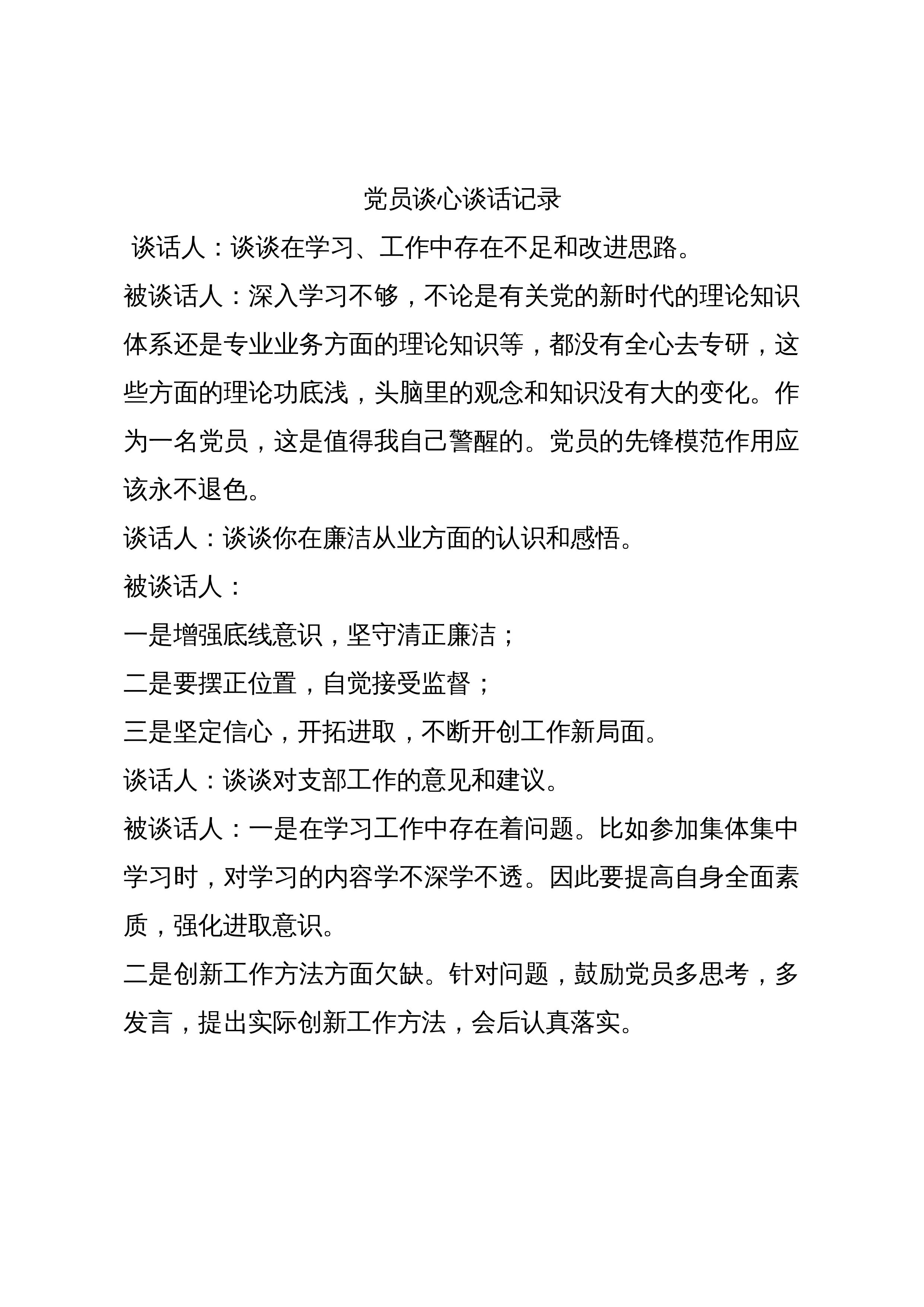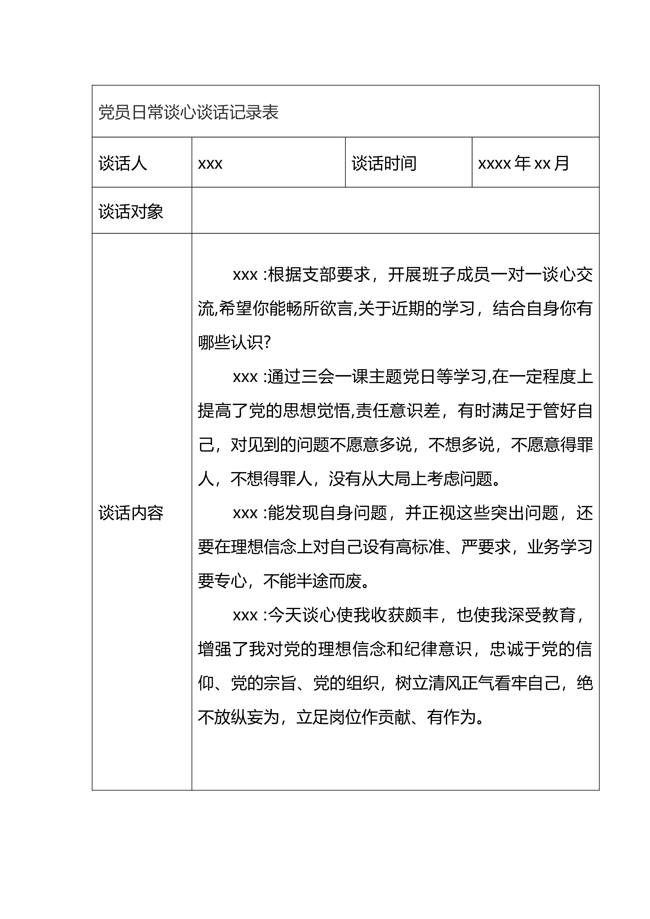 党员日常谈心谈话记录表谈话人xxx谈话时间xxxx年xx月谈话对象谈话内容xxx:根据支部要求,开展班子成员一对一谈心交流,希望你能畅所欲言,关于近期的学习,结合自身你有哪些认识?xxx:通过三会一课主题党日等学习,在一定程度上提高了党的思想觉悟,责任意识差,有时满足于管好自己,对见到的问题不愿意多说,不想多说,不愿意得罪人,不想得罪人,没有从大局上考虑问题。xxx:能发现自身问题,并正视这些突出问题,还要在理想信念上对自己设有高标准、严要求,业务学习要专心,不能半途而废。xxx:今天谈心使我收获颇丰,也使我深受教育,增强了我对党的理想信念和纪律意识,忠诚于党的信仰、党的宗旨、党的组织,树立清...