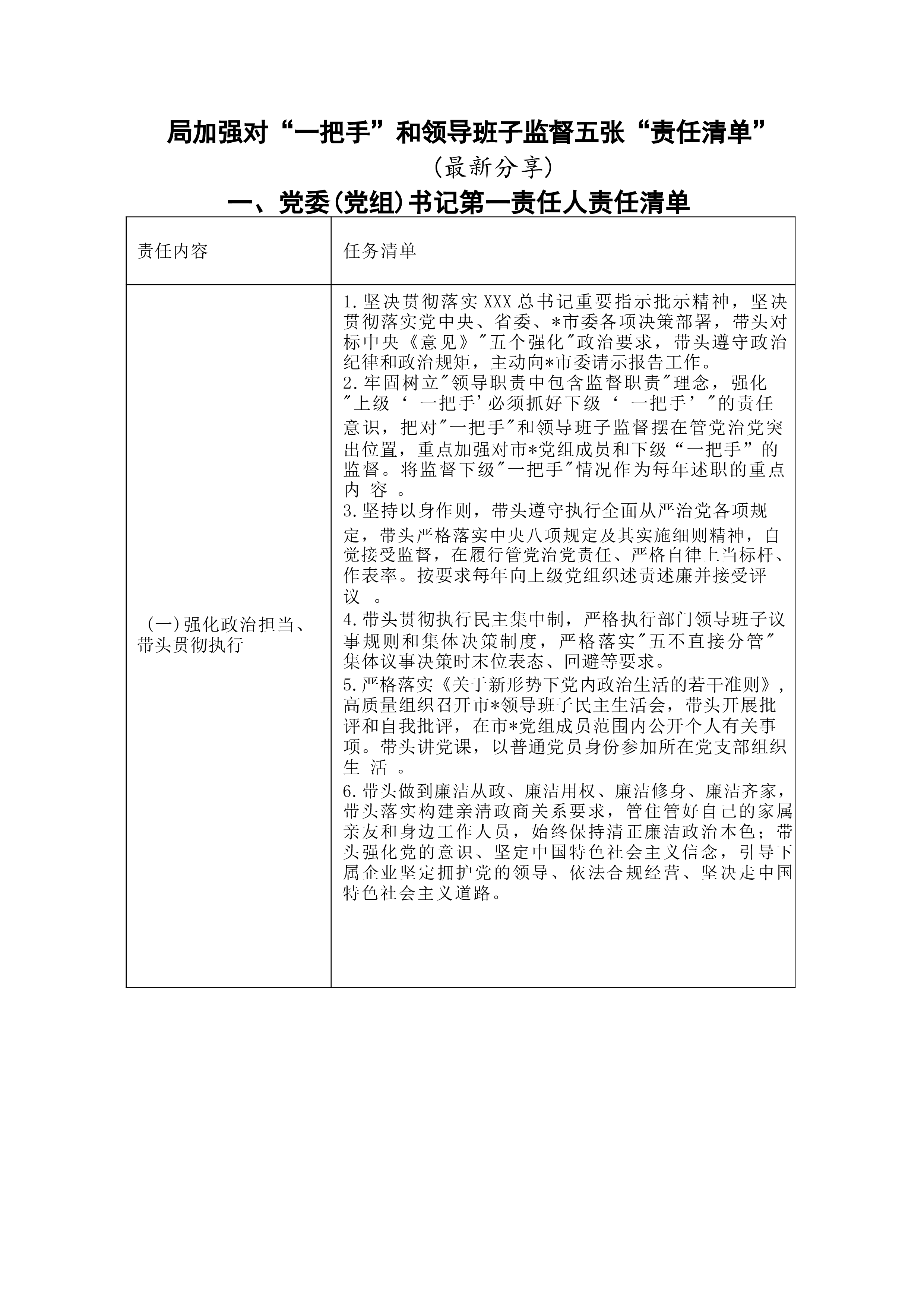 局加强对“一把手”和领导班子监督五张“责任清单”(最新分享)一、党委(党组)书记第一责任人责任清单责任内容任务清单(一)强化政治担当、带头贯彻执行1.坚决贯彻落实习近平总书记重要指示批示精神,坚决贯彻落实党中央、省委、*市委各项决策部署,带头对标中央《意见》"五个强化"政治要求,带头遵守政治纪律和政治规矩,主动向*市委请示报告工作。2.牢固树立"领导职责中包含监督职责"理念,强化"上级‘一把手'必须抓好下级‘一把手’"的责任意识,把对"一把手"和领导班子监督摆在管党治党突出位置,重点加强对市*党组成员和下级“一把手”的监督。将监督下级"一把手"情况作为每年述职的重点内容。3.坚持以身作则,带头...