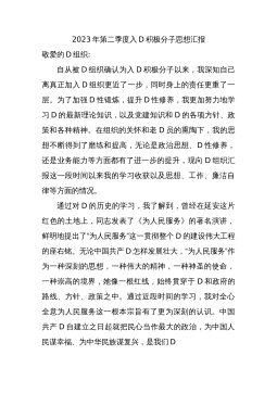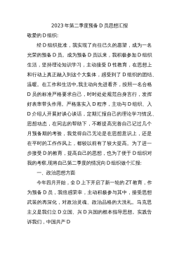 2023年第二季度预备D员思想汇报敬爱的D组织:经D组织批准,我实现了向往已久的愿望,成为一名光荣的预备D员。成为预备D员以来,我积极参加D组织生活,坚持理论知识学习,主动接受D性教育,在思想上和行动上真正融入到这个大集体,感受到了D组织的团结、温暖。在工作和生活中,我主动向先进看齐,按照一名合格D员的标准严格要求自己,时时处处规范自身言行,发挥好表率带头作用。严格落实入D程序,主动与D组织、入D介绍人开展好谈心谈话,定期汇报自己的理论学习情况、思想动态,在同志的帮助下,不断提高完善自己记过几个月预备期的考验,我觉得自己无论是在思想意识上,还是在平时的工作作风上,都较以前有了较大提高。为了进一...