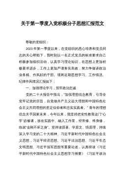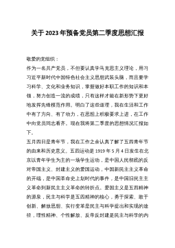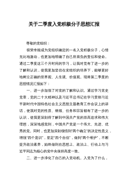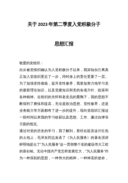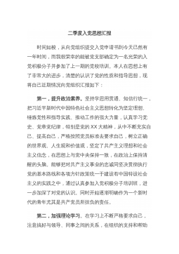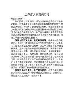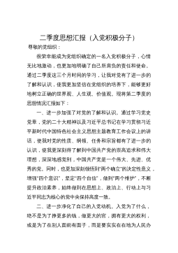 二季度入党思想汇报敬爱的党组织:初心不改,薪火相传,成为入党积极分子已有近半年的时间。在党小组及其他党员同志的教育和帮助指导下,我对加入中国共产党有了更深层次的理解。我虽然还没有加入中国共产党,但时刻以一名党员的标准来衡量自己,以一名党员的条件严格要求自己,在工作中体现出先锋模范带头作用,只有这样才能有资格加入这个光荣而先进的组织。现把二季度以来的思想汇报如下。注重加强理论武装,坚定看齐追随。积极参加学习贯彻习近平新时代中国特色社会主义思想主题教育,认真学习习近平总书记系列讲话精神,深入学习领会X工作的法律法规。坚持精读习近平总书记重要论述、重要讲话和重要指示批示,省委、省政府对X作出的一系列...