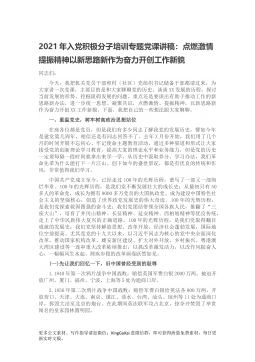 2021年入党积极分子培训专题党课讲稿:点燃激情提振精神以新思路新作为奋力开创工作新貌同志们:今天,我把机关党员干部和村(社区)党组织书记储备干部都请过来,为大家讲一次党课,主要目的是和大家聊聊党的历史、谈谈XX发展的历程,探讨当前发展的形势,挖掘阻碍发展的问题、重点还是要谈出有助于推动工作的新思路新办法,进一步统一思想、凝聚共识,点燃激情、提振精神,以新思路新作为奋力开创XX工作新貌。下面,我把自己的一些想法跟大家聊聊。一、重温党史,树牢树高政治思想站位在座各位都是党员,但是我们有多少同志了解我党的发展历史,譬如今年是建党第几周年,相信还是有同志回答不了。去年X月份开始,我们用了几个月的时间...