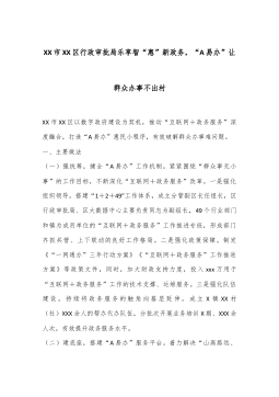 XX市XX区行政审批局乐享智“惠”新政务,“A易办”让群众办事不出村XX市XX区以数字政府建设为契机,推动“互联网+政务服务”深度融合,打造“A易办”惠民小程序,有效破解群众办事难问题。一、主要做法(一)强统筹,健全“A易办”工作机制。紧紧围绕“群众事无小事”的工作目标,不断深化“互联网+政务服务”改革。一是强化组织领导。搭建“1+2+49”工作体系,成立分管副区长任组长,区行政审批局、区大数据中心主要负责同志为副组长,49个行业部门和镇为成员单位的“互联网+政务服务”工作推进专班,形成部门齐抓共管、上下联动的良好工作格局。二是强化政策保障。制发《“一网通办”三年行动方案》《“互联网+政务服务...