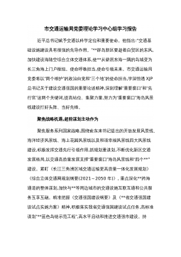 市交通运输局党委理论学习中心组学习报告近平总书记赋予交通以科学定位和重要使命。他指出:“交通基础设施建设具有很强的先导作用。”**群岛新区要趁着自贸区的东风,加快建设海陆空综合立体交通体系,使**从僻居东海一隅的岛城变为长三角海上门户枢纽。使命呼唤担当,使命引领未来。市交通运输局党委将以“两个维护”的政治自觉和“三个地”的使命担当,学深悟透XJP总书记关于建设交通强国的重要论述精神,深刻理解“重要窗口”和“先行官”这两个关键词,提高站位、集聚力量,努力为“重要窗口”海岛风景线建设打好头阵、当好先锋。聚焦战略机遇,超前谋划主动作为聚焦服务系列国家战略,围绕俞东来书记提出的开放发展风景线、海洋经济...
