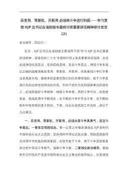 应变局、育新机、开新局必须将斗争进行到底——学习贯彻XJP总书记在省部级专题研讨班重要讲话精神研讨发言(2)各位领导,同志们:近日,XJP总书记在省部级主要领导干部“学习XJP总书记重要讲话精神,迎接党的二十大”专题研讨班上发表重要讲话强调,全党必须增强忧患意识,坚持底线思维,坚定斗争意志,增强斗争本领,以正确的战略策略应变局、育新机、开新局,依靠顽强斗争打开事业发展新天地,最根本的是要把我们自己的事情做好。敢于斗争是我们党的光荣传统和优良作风。年轻干部作为党和国家事业的接班人,必须发扬好斗争精神,锤炼斗争本领,用好斗争方法,在愈挫愈奋、愈战愈勇中不断成长,在不断的斗争中学会斗争,在不断的胜利...