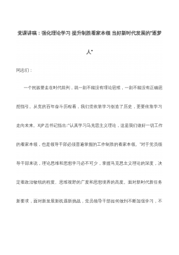 党课讲稿:强化理论学习提升制胜看家本领当好新时代发展的“逐梦人”同志们:一个民族要走在时代前列,就一刻不能没有理论思维,一刻不能没有正确思想指引。从党的百年奋斗历程看,我们党依靠学习创造了历史,更要依靠学习走向未来。XJP总书记指出:“认真学习马克思主义理论,这是我们做好一切工作的看家本领,也是领导干部必须普遍掌握的工作制胜的看家本领。”对于党员领导干部来说,理论思维和思想学习必不可少,掌握马克思主义理论的深度,决定着政治敏锐的程度、思维视野的广度和思想境界的高度。面对新时代新任务新要求,面对新发展新机遇新挑战,党员领导干部如何做到不断加强学习,不断开阔眼界、提高思想站位,通过学习赢得主动、赢...
