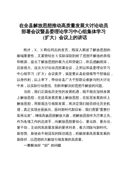 在全县解放思想推动高质量发展大讨论动员部署会议暨县委理论学习中心组集体学习(扩大)会议上的讲话刚才,X、X两位同志的发言,既深入阐述了解放思想的极端重要性,又紧密结合X实际深刻剖析了思想不解放的表现和根源,提出了解放思想的着力点和突破口,听后感触很深,启发很大。这次大讨论动员部署会议,之所以和县委理论学习中心组学习(扩大)会议套开,就是要从县处级领导干部做起,以身作则,以上率下,带动全县广大干部群众都参与到大讨论中来,以实际行动查找、剖析和解决好思想不解放的问题。当前,我们正面临历史性的发展机遇,能不能在加快发展上解放思想,在提高发展质量上解放思想,在拓宽发展路径上解放思想,用新观念引领新发展...