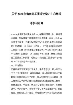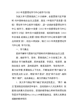 2023年党委理论学习中心组学习计划为深入学习贯彻党的二十大精神,全面贯彻习近平新时代中国特色社会主义思想,落实《中国共产党党委(党组)理论学习中心组学习规则》,进一步抓好党委理论学习中心组学习,根据***党委《2023年**党委理论学习中心组学习计划》和中共**省委宣传部、组织部印发的《2023年全省县处级以上党委(党组)理论学习中心组专题学习重点内容安排》,结合**局实际,制订2023年局党委理论学习中心组学习计划。一、学习重点坚持不懈学习贯彻习近平新时代中国特色社会主义思想,做好学习、宣传、贯彻党的二十大各项工作,巩固党史学习教育成果,坚持读原著、学原文、悟原理,做到自觉主动学、及时跟进...