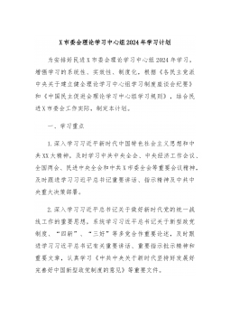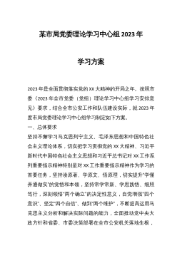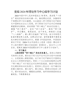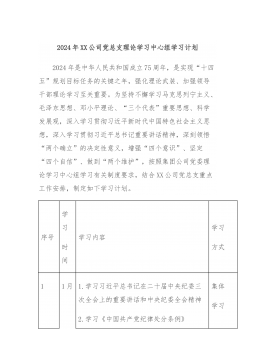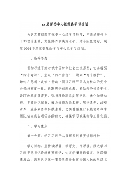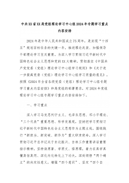 中共XX省XX局党组理论学习中心组2024年专题学习重点内容安排2024年是中华人民共和国成立75周年,是实现“十四五”规划目标任务的关键一年,推进理论武装、加强领导干部理论学习至关重要。为深入学习贯彻习近平新时代中国特色社会主义思想和党的XX大精神,贯彻落实《中国共产党党委(党组)理论学习中心组学习规则》和《关于进一步提高党委(党组)理论学习中心组学习质量的意见》,按照《2024年全省各级党委(党组)理论学习中心组专题学习重点内容安排》和局党组的部署要求,对2024年党组理论学习中心组专题学习重点内容安排如下。一、学习重点深入学习马克思列宁主义、毛泽东思想、邓小平理论、“三个代表”重要思想、...