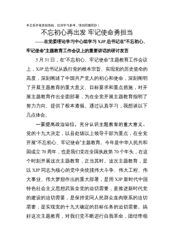 本文系作者原创投稿,仅供学习参考,请勿照搬照抄!不忘初心再出发牢记使命勇担当——在党委理论学习中心组学习XJP总书记在“不忘初心、牢记使命”主题教育工作会议上的重要讲话的研讨发言5月31日,在“不忘初心、牢记使命”主题教育工作会议上,XJP总书记从践行党的根本宗旨、实现党的历史使命的高度,深刻阐述了中国共产党人的初心和使命,深刻阐明了开展主题教育的重大意义、目标要求和重点措施,对开展主题教育作出全面部署,为在全党开展主题教育指明了努力方向、提供了根本遵循。通过认真学习,我想谈以下几点体会。一要提高政治站位,充分认识主题教育的重大意义。党的十九大决定,以县处级以上领导干部为重点,在全党开展“不忘...