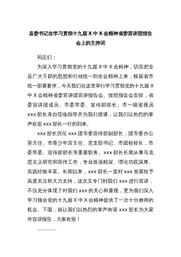 县委书记在学习贯彻十九届X中X会精神省委宣讲团报告会上的主持词同志们:为深入学习贯彻党的十九届X中X会精神,切实把全县广大干群的思想和行动统一到全会精神上来,根据省市统一部署要求,今天我们在这里举行学习贯彻党的十九届X中X会精神省委宣讲团宣讲报告会。按照报告会安排,省委宣讲团成员、市委常委、宣传部部长、市一级巡视员xxx部长亲自莅临指导并为我们授课,让我们以热烈的掌声欢迎xxx部长一行的到来。xxx部长历任xxx团市委宣传部副部长,团市委办公室主任、市青少年宫主任、党支部书记、市团校校长,市委常委、宣传部部长等重要职务。xxx部长长期从事马克思主义研究和宣传工作,专业造诣精深、理论功底深厚、实...