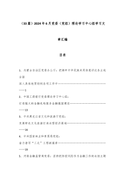 (33篇)2024年6月党委(党组)理论学习中心组学习文章汇编目录1.内蒙古自治区党委办公厅:把铸牢中华民族共同体意识这条主线全面深入具体地贯彻到各项工作中………………………………………………12.中国工商银行党委理论学习中心组:打造强大的金融机构服务金融强国建设……………………………………133.中共黑龙江省文化和旅游厅党组:发展特色文化旅游打造冰雪经济高地………………………………………164.中共国家林业和草原局党组:奋力谱写“三北”工程新篇章………………………………………………195.河南金融监管局党委:坚持把防控风险作为金融工作的永恒主题奋力谱写中国式现代化的河南金融篇章…………………...