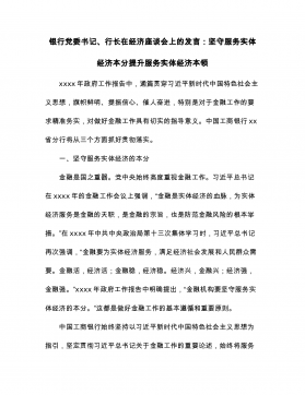 银行党委书记、行长在经济座谈会上的发言:坚守服务实体经济本分提升服务实体经济本领xxxx年政府工作报告中,通篇贯穿习近平新时代中国特色社会主义思想,旗帜鲜明、提振信心、催人奋进,特别是对于金融工作的要求精准务实,对做好金融工作具有切实的指导意义。中国工商银行xx省分行将从三个方面抓好贯彻落实。一、坚守服务实体经济的本分金融是国之重器。党中央始终高度重视金融工作。习近平总书记在xxxx年的金融工作会议上强调,“金融是实体经济的血脉,为实体经济服务是金融的天职,是金融的宗旨,也是防范金融风险的根本举措。”在xxxx年中共中央政治局第十三次集体学习时,习近平总书记再次强调,“金融要为实体经济服务,满...