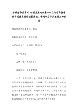 廿载芳华正当时创新发展向未来——在烟台科技学院高质量发展论坛暨建校二十周年办学成果展上的讲话烟台科技学院董事长、校长尊敬的各位领导、各位来宾亲爱的校友们、老师们、同学们: 大家晚上好! 山纳千峰,育桃李芬芳 海涵万水,铸教育辉煌 今天,我们欢聚一堂,怀着无比激动和自豪的心情,共同庆祝烟台科技学院二十华诞。在这喜庆而庄严的时刻我谨代表学校全体师生,向莅临庆典的各位领导、各位嘉宾表示最热烈的欢迎!向遍布五湖四海、心系母校的广大校友致以最诚挚的问候!向二十年来为学校发展筑基拓荒薪火相传的历代建设者们,表示最崇高的敬意! 二十年光阴,于历史长河不过弹指一瞬;但对一所学校而言,却是一部从无到有、用初心写就的奋斗史诗。回望来时路,我们的心中澎湃着无限的感慨,若要为这段岁月寻找一个精神图腾,我想...