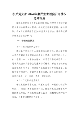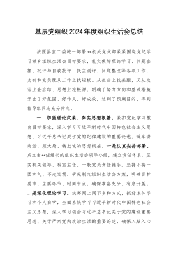 基层党组织2024年度组织生活会总结按照县直工委统一部署,**机关党支部紧紧围绕党纪学习教育组织生活会目标要求,扎实做好理论学习、问题查摆、批评与自我批评、民主测评、问题整改等各项工作,支部和党员既从工作上找短板、从担当上找差距,又从政治上查症结、思想上挖根源,明确了努力方向和整改措施开出了好氛围、好作风、好成效,达到了预期目的,得到指导组同志充分肯定。一、加强理论武装,夯实思想根基。紧扣党纪学习教育目标要求,深入学习习近平新时代中国特色社会主义思想、习近平总书记关于党的纪律建设的重要论述,筑牢讲政治、顾大局、铸忠诚的思想根基。一是认真安排部署。成立由**任组长的组织生活会领导小组,建立责任体...
