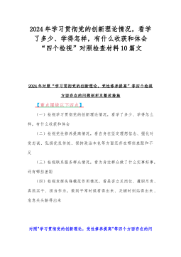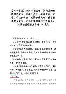 【四个检视】2024年检视学习贯彻党的创新理论情况,看学了多少、学得怎样,有什么收获和体会、党性修养提高、联系服务群众情况,发挥先锋模范作用专题个人对照检视检查发言材料4篇文