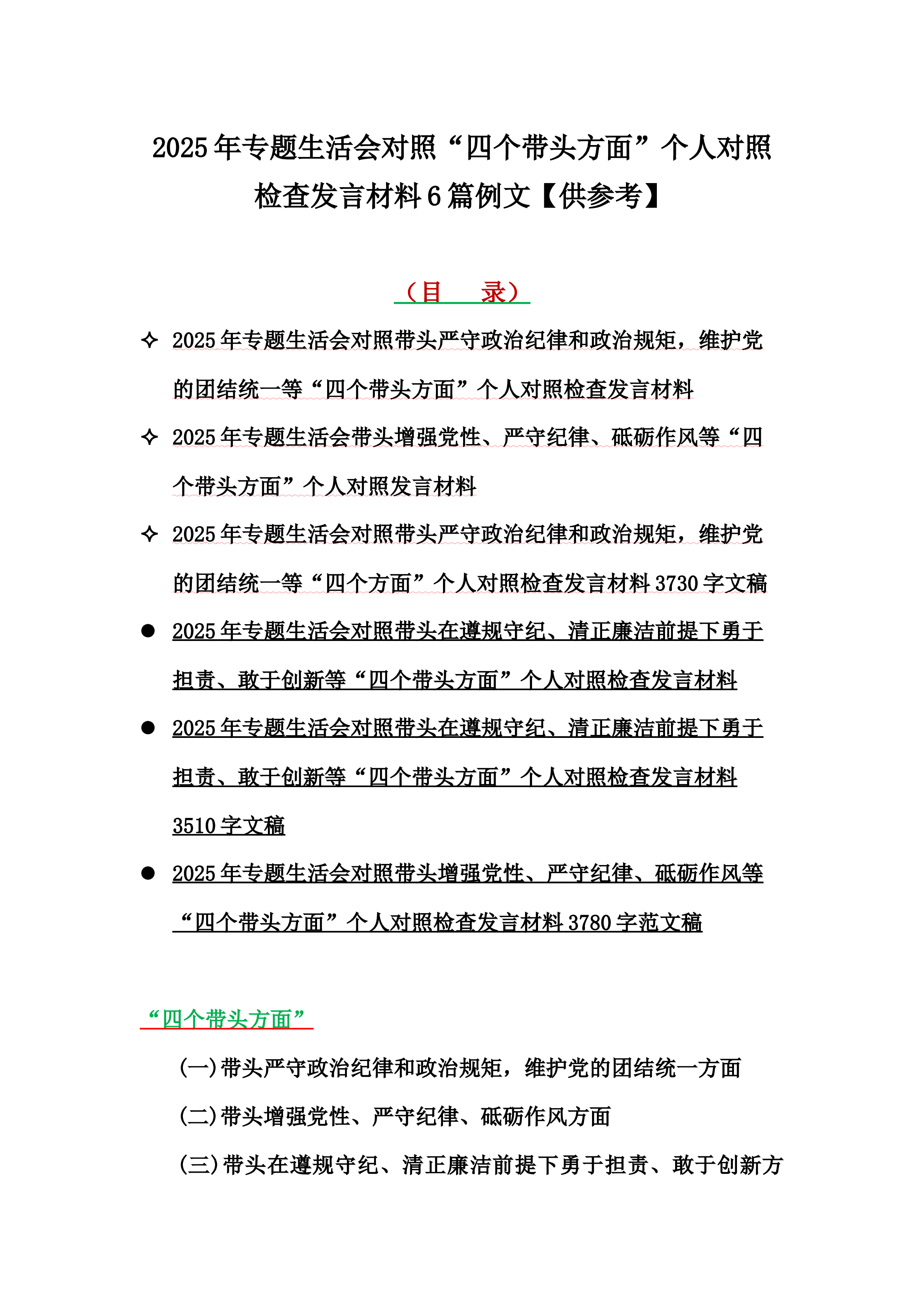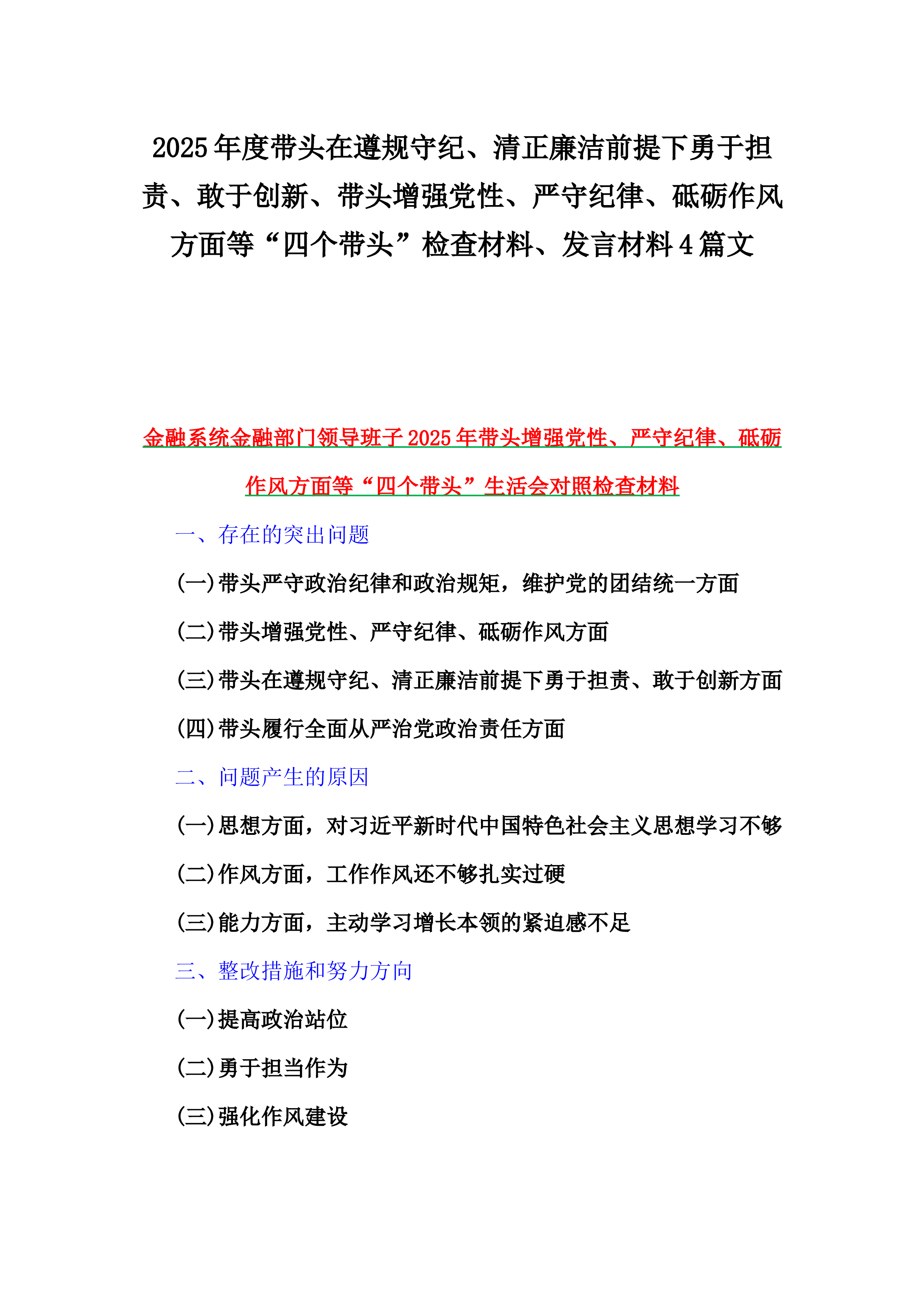 2025年度带头在遵规守纪、清正廉洁前提下勇于担责、敢于创新、带头增强党性、严守纪律、砥砺作风方面等“四个带头”检查材料、发言材料4篇文