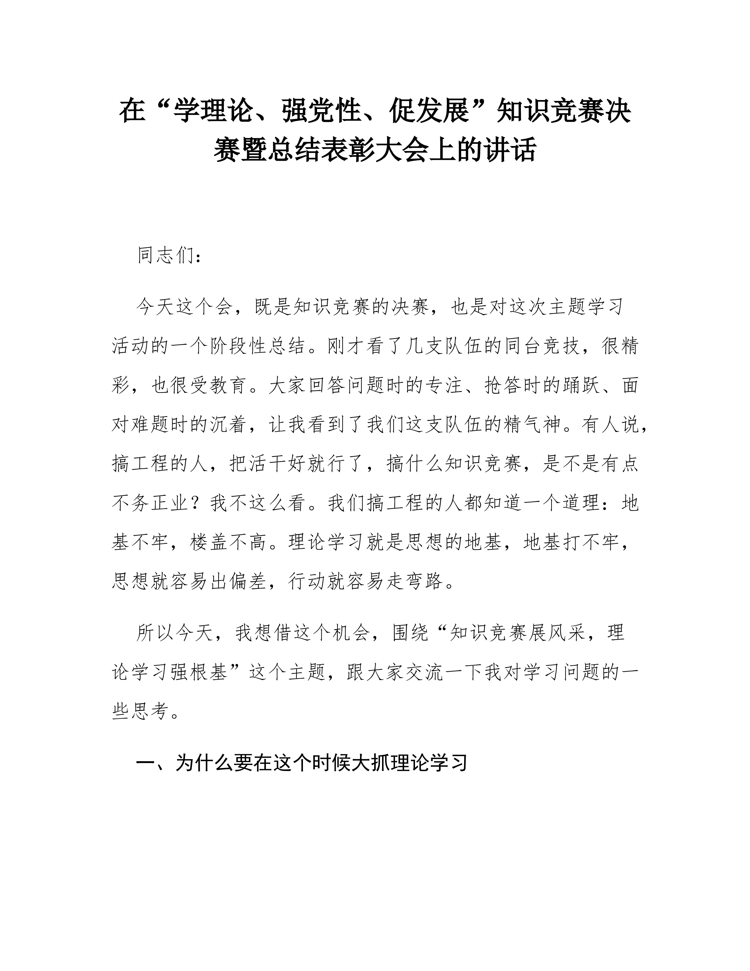 在“学理论、强党性、促发展”知识竞赛决赛暨总结表彰大会上的讲话同志们:今天这个会,既是知识竞赛的决赛,也是对这次主题学习活动的一个阶段性总结。刚才看了几支队伍的同台竞技,很精彩,也很受教育。大家回答问题时的专注、抢答时的踊跃、面对难题时的沉着,让我看到了我们这支队伍的精气神。有人说,搞工程的人,把活干好就行了,搞什么知识竞赛,是不是有点不务正业?我不这么看。我们搞工程的人都知道一个道理:地基不牢,楼盖不高。理论学习就是思想的地基,地基打不牢,思想就容易出偏差,行动就容易走弯路。所以今天,我想借这个机会,围绕“知识竞赛展风采,理论学习强根基”这个主题,跟大家交流一下我对学习问题的一些思考。一、为什么要在这个时候大抓理论学习这个问题,很多人心里可能有疑问。工作这么忙,任务这么重,为什么还要花时间...