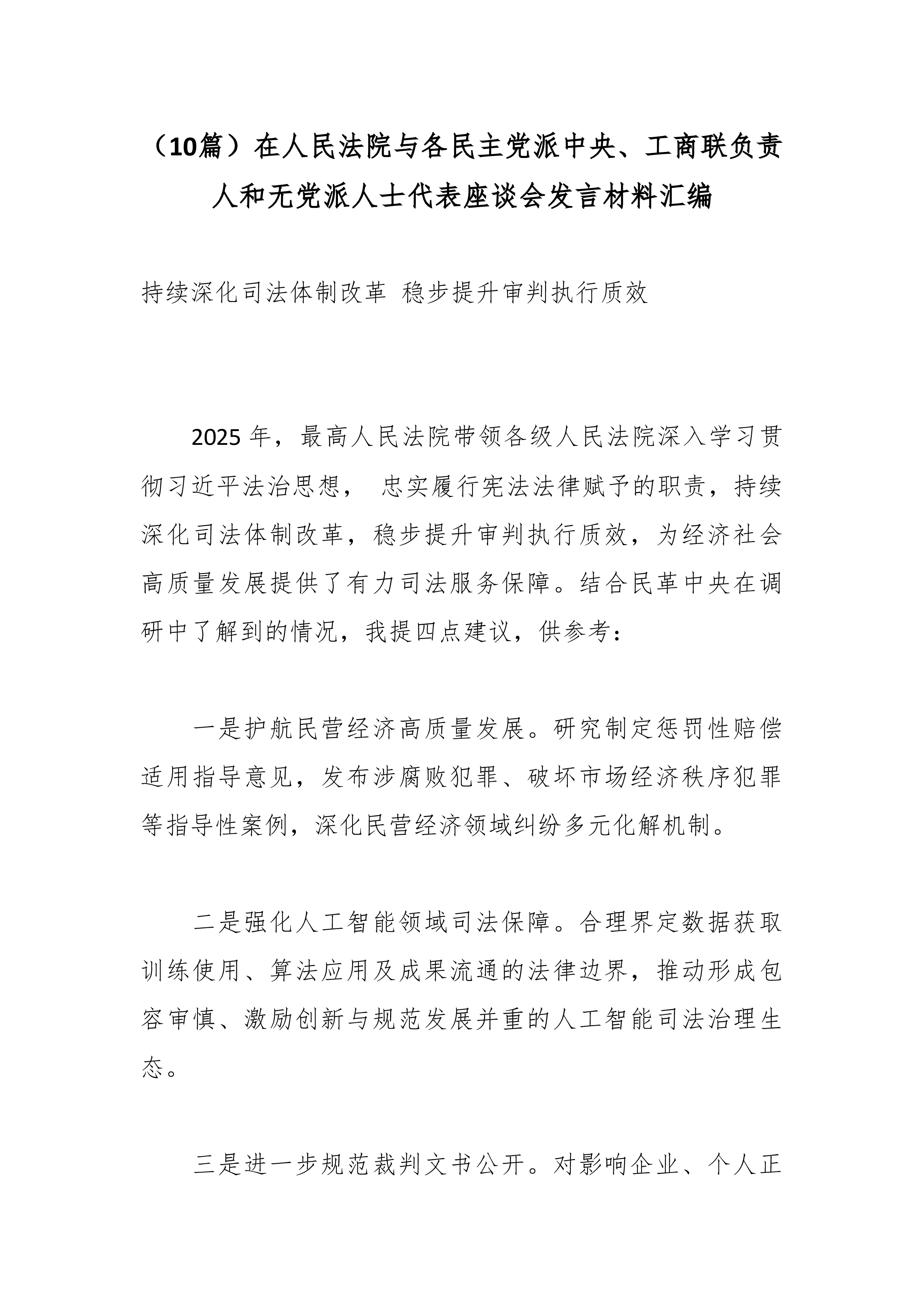 (10篇)在人民法院与各民主党派中央、工商联负责人和无党派人士代表座谈会发言材料汇编持续深化司法体制改革稳步提升审判执行质效 2025年,最高人民法院带领各级人民法院深入学习贯彻习近平法治思想,忠实履行宪法法律赋予的职责,持续深化司法体制改革,稳步提升审判执行质效,为经济社会高质量发展提供了有力司法服务保障。结合民革中央在调研中了解到的情况,我提四点建议,供参考: 一是护航民营经济高质量发展。研究制定惩罚性赔偿适用指导意见,发布涉腐败犯罪、破坏市场经济秩序犯罪等指导性案例,深化民营经济领域纠纷多元化解机制。 二是强化人工智能领域司法保障。合理界定数据获取训练使用、算法应用及成果流通的法律边界,推动形成包容审慎、激励创新与规范发展并重的人工智能司法治理生态。 三是进一步规范裁判文书公开...