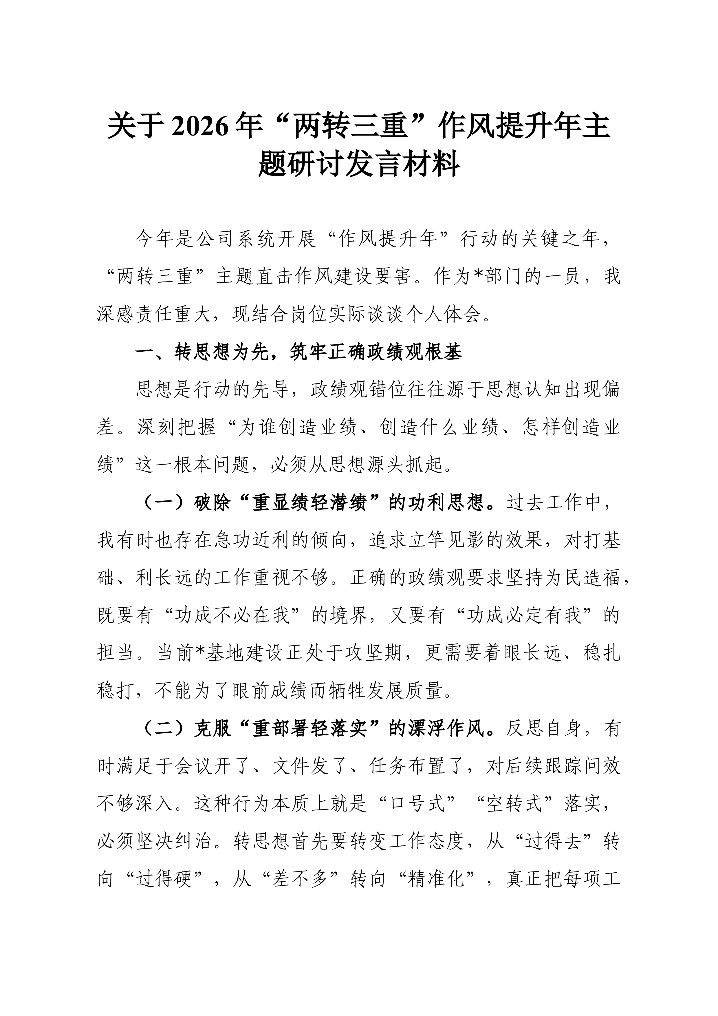 关于2026年“两转三重”作风提升年主题研讨发言材料今年是公司系统开展“作风提升年”行动的关键之年,“两转三重”主题直击作风建设要害。作为*部门的一员,我深感责任重大,现结合岗位实际谈谈个人体会。一、转思想为先,筑牢正确政绩观根基思想是行动的先导,政绩观错位往往源于思想认知出现偏差。深刻把握“为谁创造业绩、创造什么业绩、怎样创造业绩”这一根本问题,必须从思想源头抓起。(一)破除“重显绩轻潜绩”的功利思想。过去工作中,我有时也存在急功近利的倾向,追求立竿见影的效果,对打基础、利长远的工作重视不够。正确的政绩观要求坚持为民造福,既要有“功成不必在我”的境界,又要有“功成必定有我”的担当。当前*基地建设正处于攻坚期,更需要着眼长远、稳扎稳打,不能为了眼前成绩而牺牲发展质量。(二)克服“重部署轻落实...