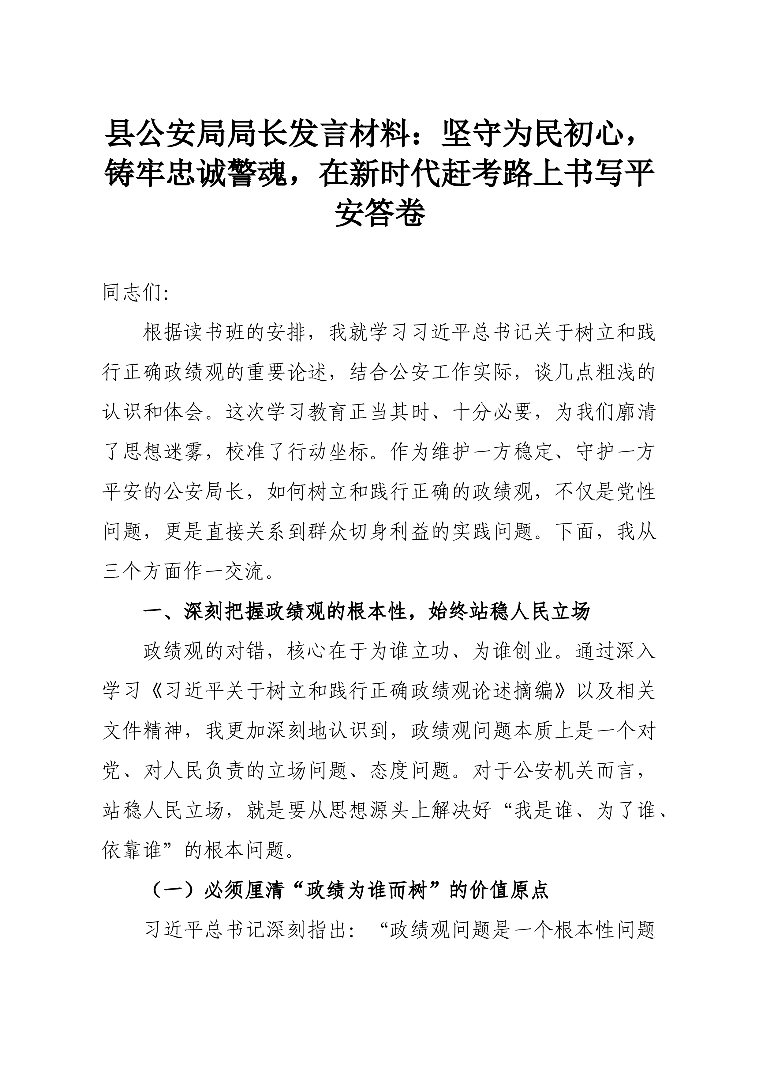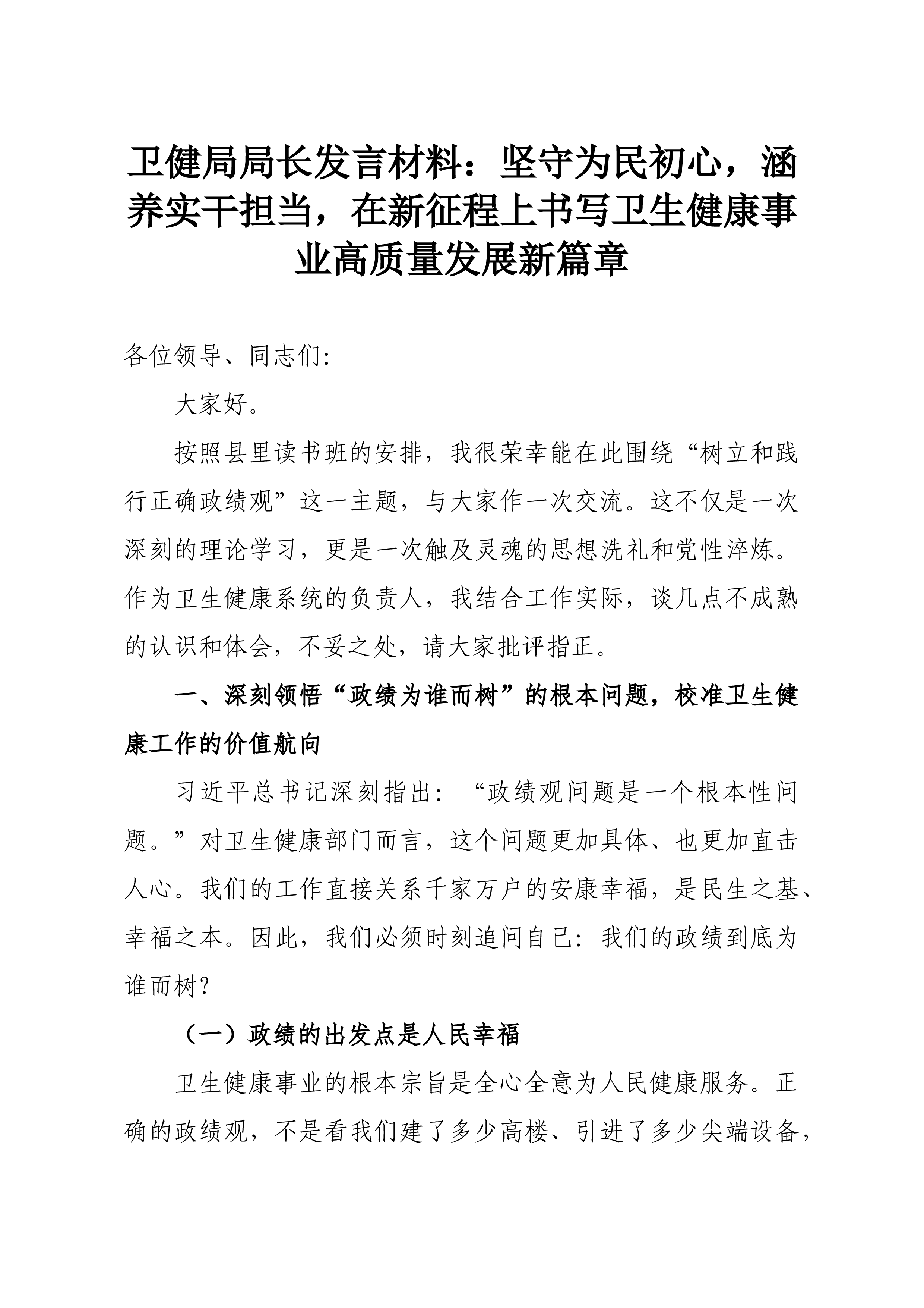 卫健局局长发言材料:坚守为民初心,涵养实干担当,在新征程上书写卫生健康事业高质量发展新篇章各位领导、同志们:大家好。按照县里读书班的安排,我很荣幸能在此围绕“树立和践行正确政绩观”这一主题,与大家作一次交流。这不仅是一次深刻的理论学习,更是一次触及灵魂的思想洗礼和党性淬炼。作为卫生健康系统的负责人,我结合工作实际,谈几点不成熟的认识和体会,不妥之处,请大家批评指正。一、深刻领悟“政绩为谁而树”的根本问题,校准卫生健康工作的价值航向习近平总书记深刻指出:“政绩观问题是一个根本性问题。”对卫生健康部门而言,这个问题更加具体、也更加直击人心。我们的工作直接关系千家万户的安康幸福,是民生之基、幸福之本。因此,我们必须时刻追问自己:我们的政绩到底为谁而树?(一)政绩的出发点是人民幸福卫生健康事业的根本...