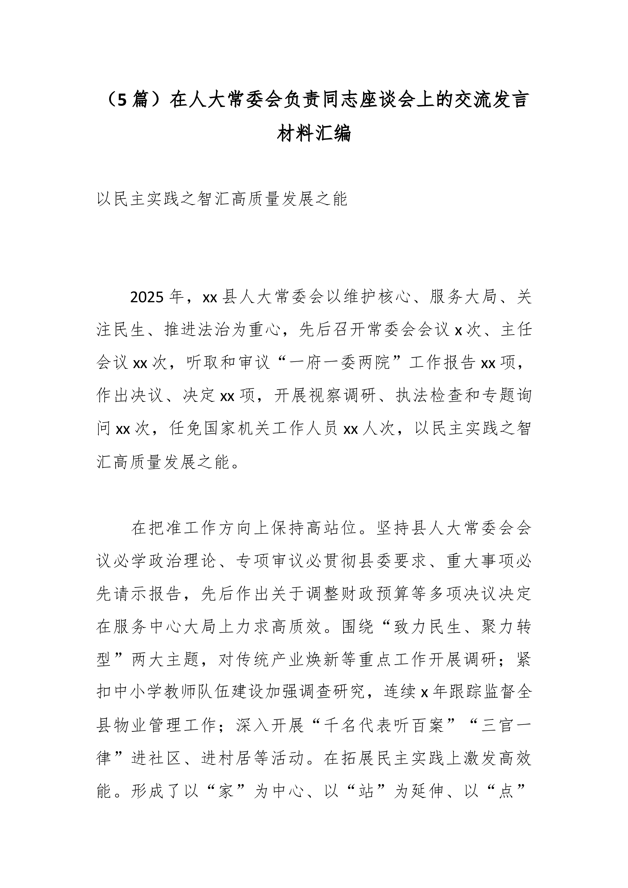 (10篇)在人民法院与各民主党派中央、工商联负责人和无党派人士代表座谈会发言材料汇编持续深化司法体制改革稳步提升审判执行质效 2025年,最高人民法院带领各级人民法院深入学习贯彻习近平法治思想,忠实履行宪法法律赋予的职责,持续深化司法体制改革,稳步提升审判执行质效,为经济社会高质量发展提供了有力司法服务保障。结合民革中央在调研中了解到的情况,我提四点建议,供参考: 一是护航民营经济高质量发展。研究制定惩罚性赔偿适用指导意见,发布涉腐败犯罪、破坏市场经济秩序犯罪等指导性案例,深化民营经济领域纠纷多元化解机制。 二是强化人工智能领域司法保障。合理界定数据获取训练使用、算法应用及成果流通的法律边界,推动形成包容审慎、激励创新与规范发展并重的人工智能司法治理生态。 三是进一步规范裁判文书公开...