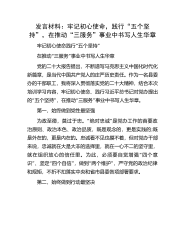 发言材料:牢记初心使命,践行“五个坚持”,在推动“三服务”事业中书写人生华章“”牢记初心使命践行五个坚持“”在推动三服务事业中书写人生华章党的二十大报告提出,不断谱写马克思主义中国化时代化新篇章,是当代中国共产党人的庄严历史责任。作为一名县委办的干部职工,我将深入贯彻落实党的二十大精神,结合本次培训学习内容,牢记初心使命、践行习近平总书记对党办提出“”“”的五个坚持,在推动三服务事业中书写人生华章。第一,始终做到党性最坚强“”为政至德,莫过于忠。绝对忠诚是党办工作的首要政治原则、政治本色、政治品质,既是观念的,更是实践的;既是外在的,更是内在的。忠诚看不见也摸不着,但对党办干部来说,忠诚就在大...