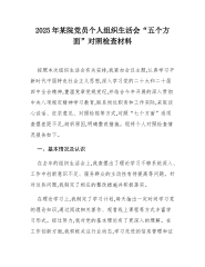 2025年某院党员个人组织生活会“五个方面”对照检查材料按照本次组织生活会有关安排,我紧扣会议主题,认真学习平新时代中国特色社会主义思想,深入学习党的二十大和二十届四中全会精神,重温党章党规党纪,并结合今年开展的深入贯彻中央八项规定精神学习教育,联系岗位职责和工作实际,采取谈心谈话、征求意见、对照检视等方式,对照“七个方面”逐项查摆差距不足,剖析原因,明确整改措施。现将个人对照检查情况报告如下。一、基本情况及认识在去年的组织生活会上,我查摆出了理论学习不够系统深入、工作中创新意识不足、服务群众的主动性有待提高等问题。针对这些问题,我制定了相应的整改措施并积极落实。在理论学习上,我制定了学习计划,每天抽出一定时间学习党的理论知识,通过阅读相关著作、观看线上课程等方式丰富学习形式。经过努力,我对...