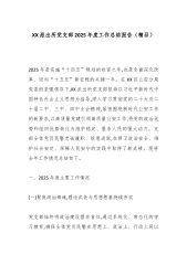 XX县村(社区)"两委"换届工作总结报告XX县坚持把村(社区)"两委"换届作为建强基层战斗堡垒、夯实党的执政根基的战略性工程,立足县域实际,紧扣"推进节奏有序、人选摸排有数、政策落实有力、风险防范有效"总体要求,坚持高标准谋划、高起点开局、高质量推进,精准下好换届工作"一盘棋",织密统筹部署"一张网",圆满完成了换届选举各项任务。一、村(社区)"两委"换届工作总体情况XX县辖XX个行政村和XX个牧业队,此次村(社区)"两委"换届涉及党支部XX个,村委会XX个。截至目前,全县所有村(社区)"两委"换届工作已圆满完成,选举产生支委班子XX人,选举产生村委班子XX人,整体实现年龄、学历"一降一升"目标,选优配强了村级组织带头人队伍,为全面推进乡村振兴提供了坚强组织保证。(一)把稳"方向盘",全面体...