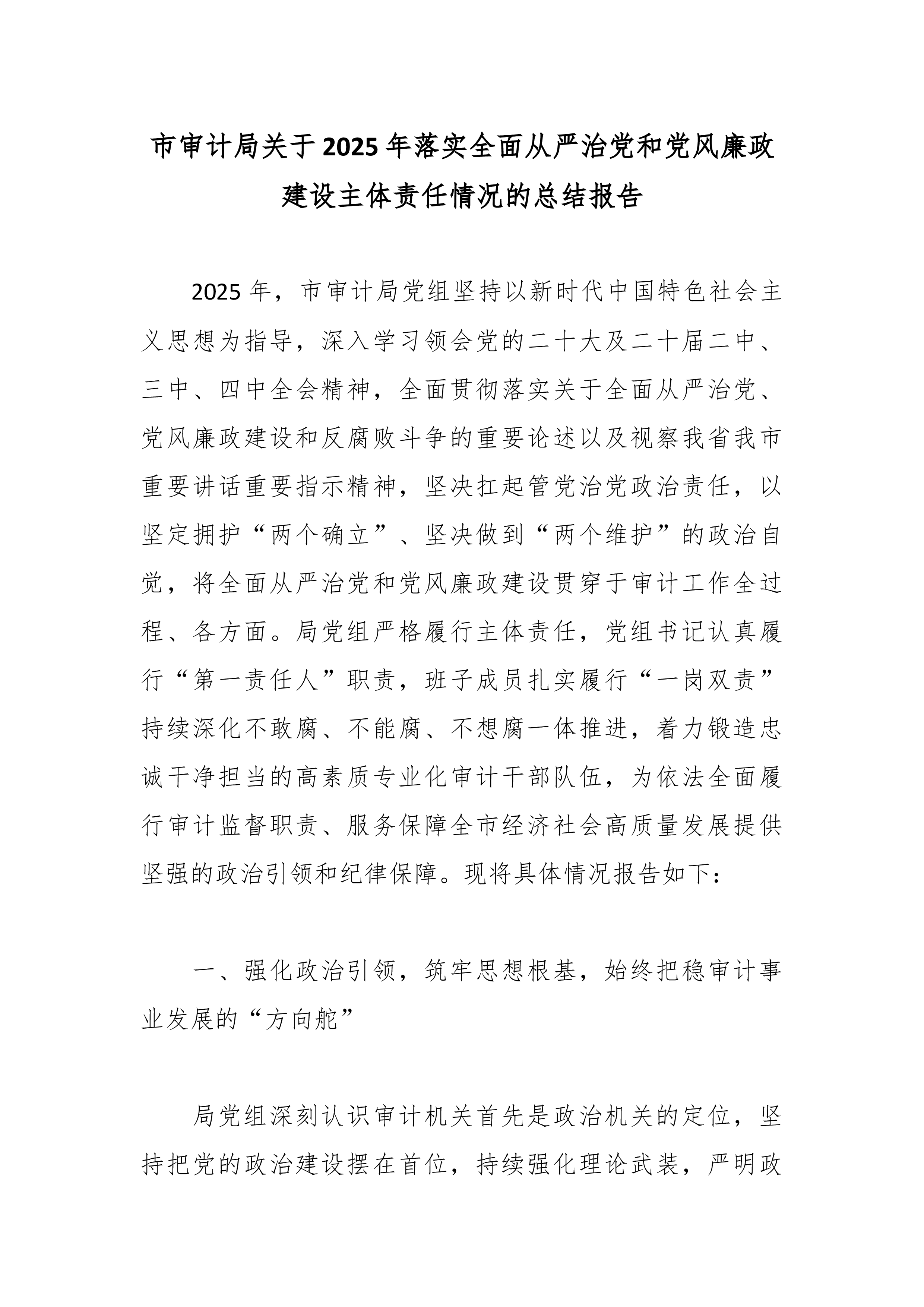 市审计局关于2025年落实全面从严治党和党风廉政建设主体责任情况的总结报告 2025年,市审计局党组坚持以新时代中国特色社会主义思想为指导,深入学习领会党的二十大及二十届二中、三中、四中全会精神,全面贯彻落实关于全面从严治党、党风廉政建设和反腐败斗争的重要论述以及视察我省我市重要讲话重要指示精神,坚决扛起管党治党政治责任,以坚定拥护“两个确立”、坚决做到“两个维护”的政治自觉,将全面从严治党和党风廉政建设贯穿于审计工作全过程、各方面。局党组严格履行主体责任,党组书记认真履行“第一责任人”职责,班子成员扎实履行“一岗双责”持续深化不敢腐、不能腐、不想腐一体推进,着力锻造忠诚干净担当的高素质专业化审计干部队伍,为依法全面履行审计监督职责、服务保障全市经济社会高质量发展提供坚强的政治引领和纪律保...