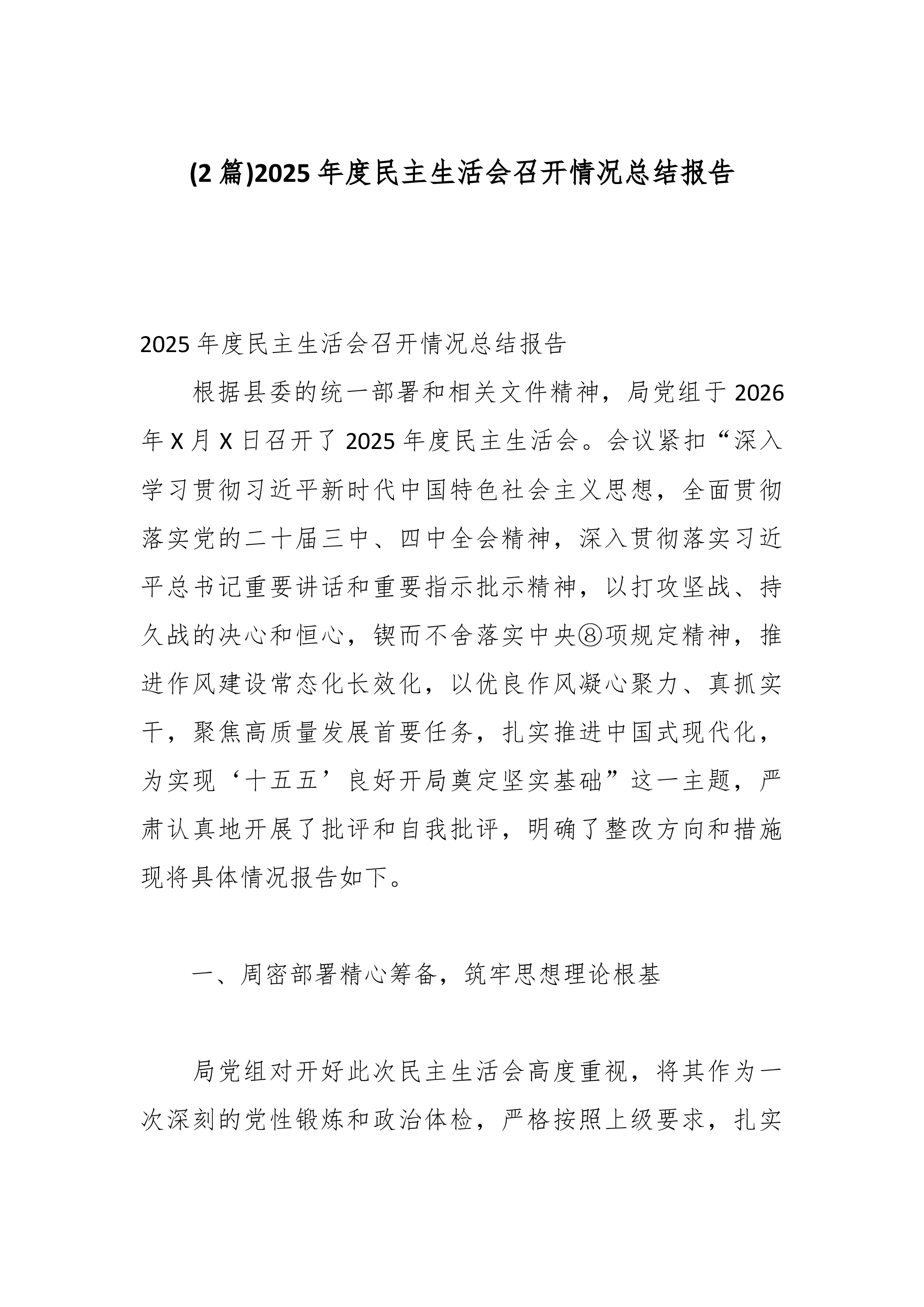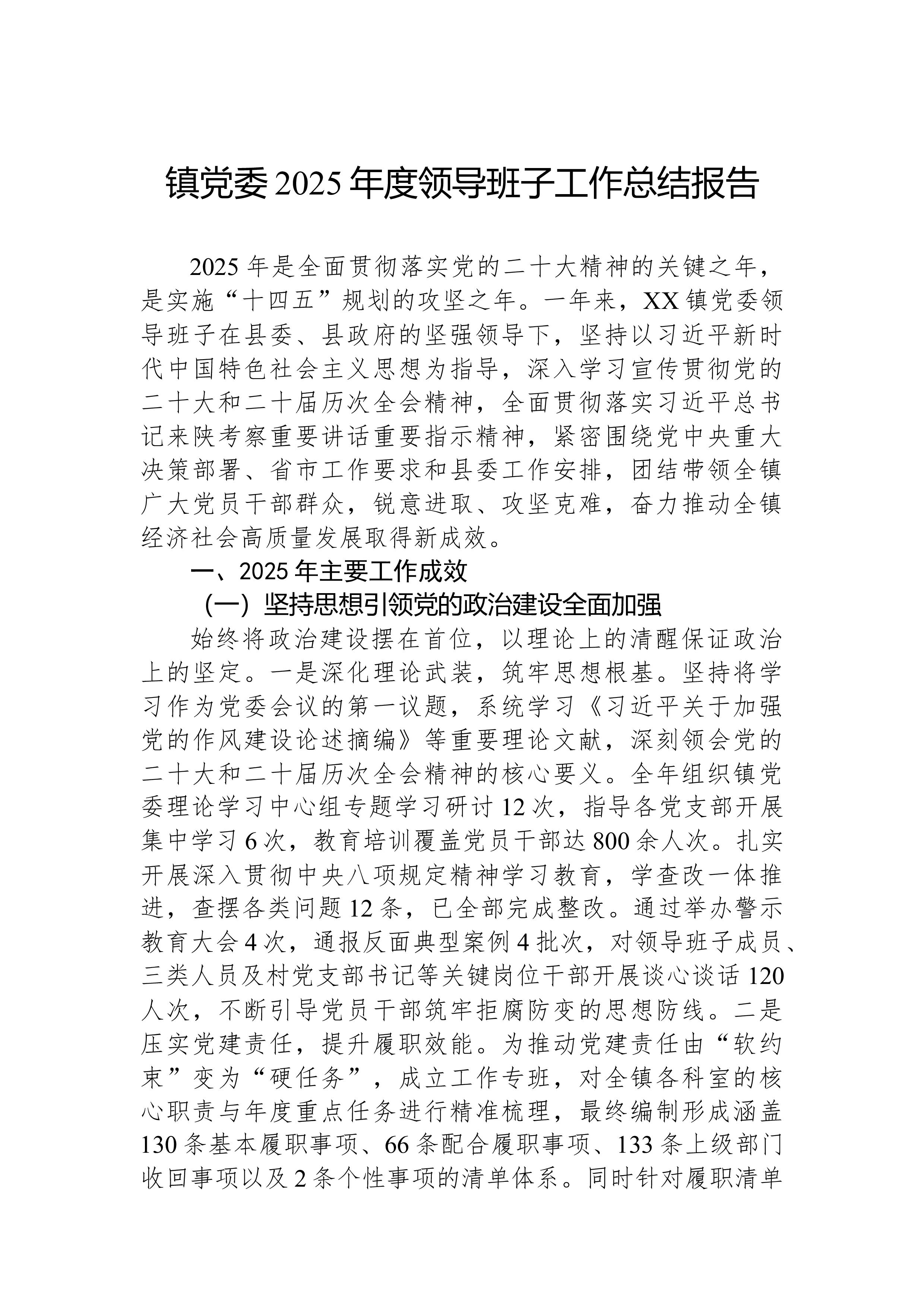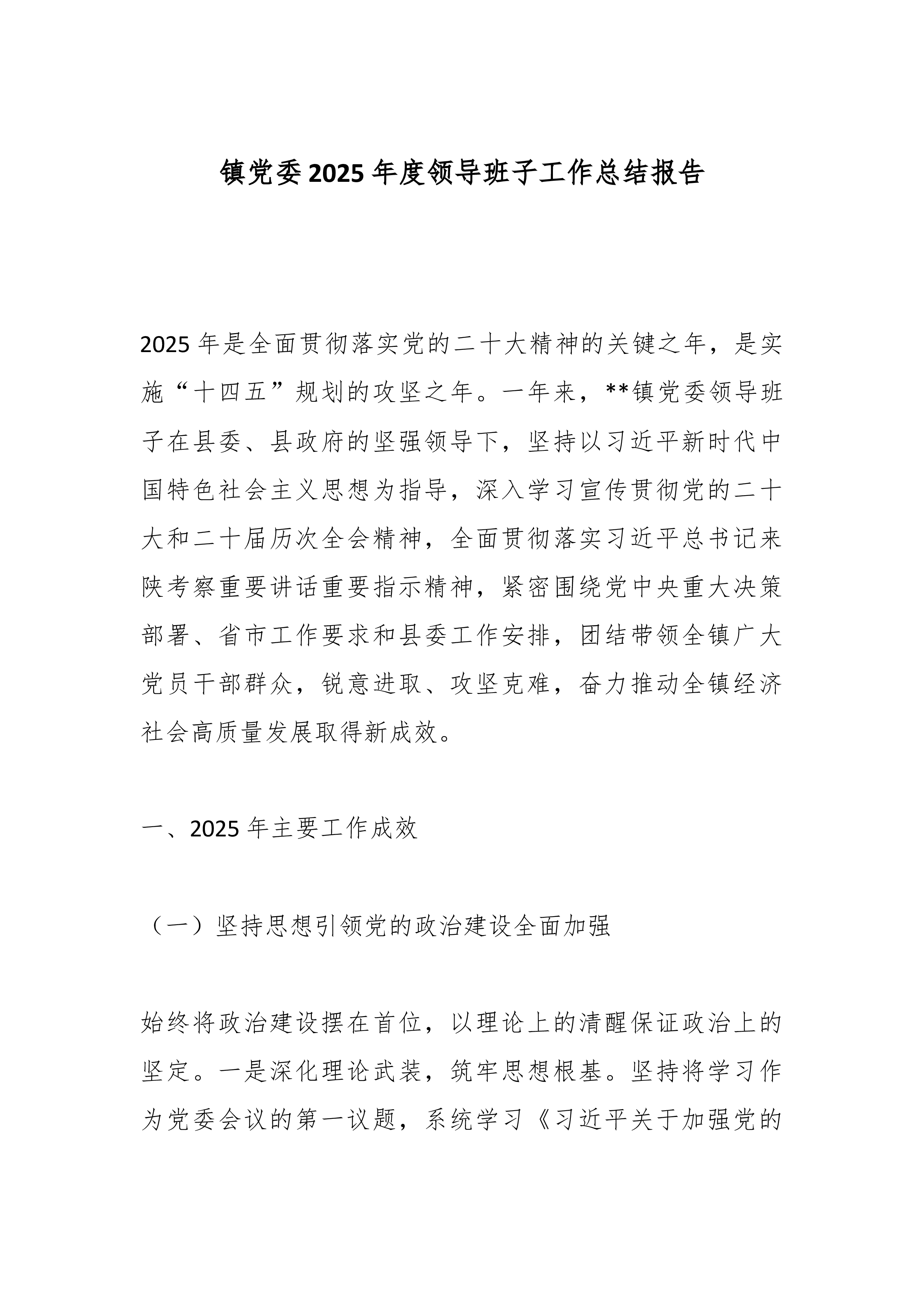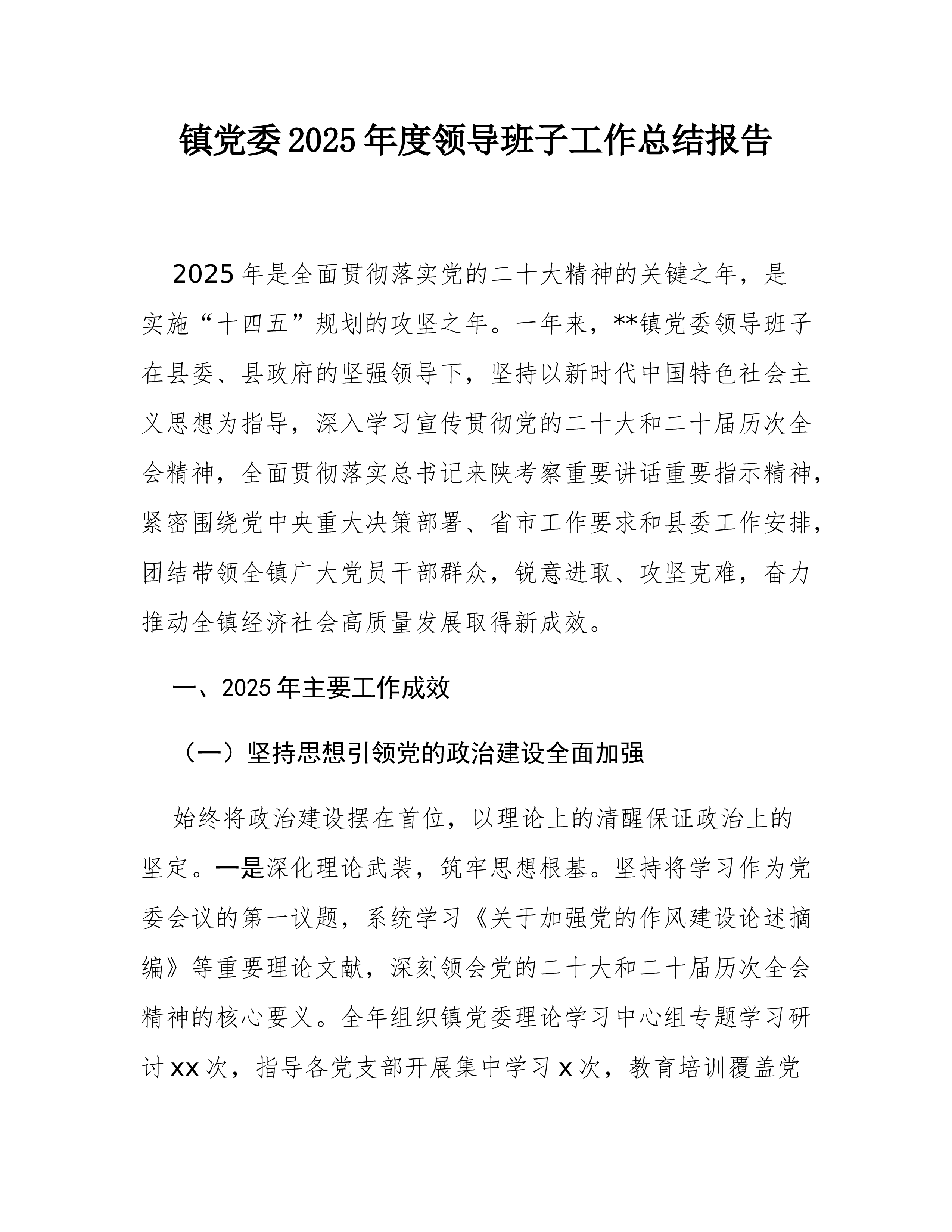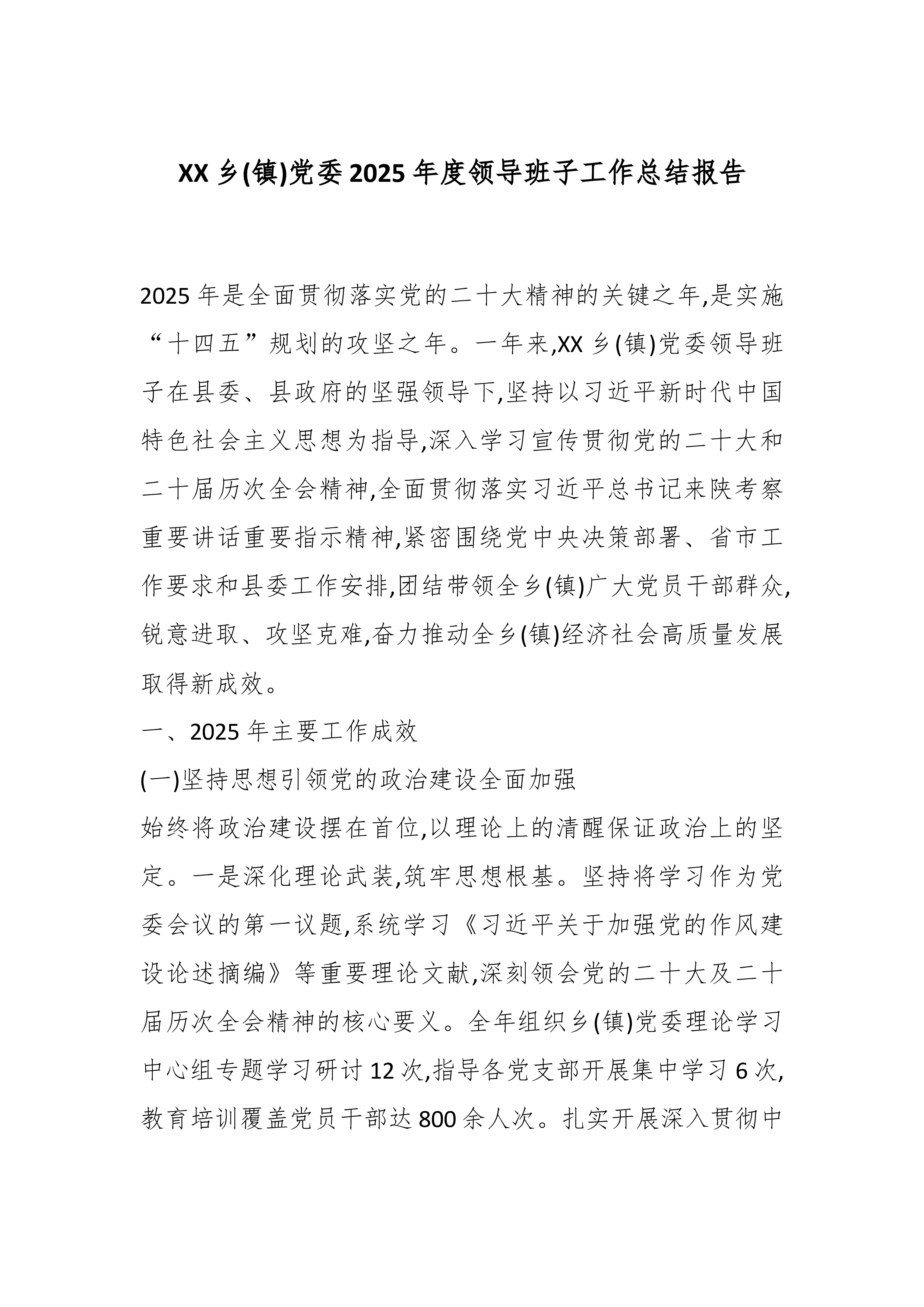 XX乡(镇)党委2025年度领导班子工作总结报告2025年是全面贯彻落实党的二十大精神的关键之年,是实施“十四五”规划的攻坚之年。一年来,XX乡(镇)党委领导班子在县委、县政府的坚强领导下,坚持以习近平新时代中国特色社会主义思想为指导,深入学习宣传贯彻党的二十大和二十届历次全会精神,全面贯彻落实习近平总书记来陕考察重要讲话重要指示精神,紧密围绕党中央决策部署、省市工作要求和县委工作安排,团结带领全乡(镇)广大党员干部群众,锐意进取、攻坚克难,奋力推动全乡(镇)经济社会高质量发展取得新成效。一、2025年主要工作成效(一)坚持思想引领党的政治建设全面加强始终将政治建设摆在首位,以理论上的清醒保证政治上的坚定。一是深化理论武装,筑牢思想根基。坚持将学习作为党委会议的第一议题,系统学习《习近平关于...
