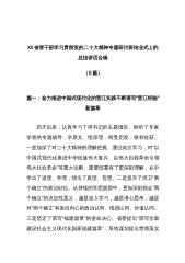 XX省管干部学习贯彻党的二十大精神专题研讨班结业式上的总结讲话合辑(5篇)篇一:奋力推进中国式现代化的晋江实践不断谱写“晋江经验”新篇章四天以来,认真学习了周书记的主题报告、聆听了专家学者的专题辅导,学原文、悟原理,很受启发,很有收获。一是加深了对二十大精神的理解把握。通过此次学习,对“以中国式现代化推进中华民族伟大复兴、以伟大自我革命引领伟大社会革命”等重大论断、重要部署有了更深刻理解,从中学出了道理、学理,悟出了真理、哲理。二是提升了捍卫“两个确立”的政治站位。从持续的学思践悟中,更加深刻领会“两个确立”的决定性意义,越是深入学习,越是潜心思考,越是对“两个确立”有发自内心的政治认同、情感...