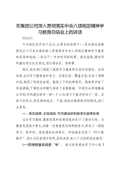 在集团公司深入贯彻落实中央八项规定精神学习教育总结会上的讲话同志们:今天我们召开这个会议,主要目的有两个:一是全面总结集团近五个月来开展的深入贯彻落实中央八项规定精神学习教育的成效和经验;二是对下一步如何巩固成果、深化拓展,推动作风建设常态化长效化,进行再动员、再部署。刚才,相关部门通报了集团学习教育的总结评估报告。总的来看,这次学习教育组织有力、内容扎实、覆盖全面,达到了预期目标,取得了阶段性成效。集团上下的纪律意识、规矩意识有了明显增强,干事创业的精气神有了显著提振。但我们必须清醒地认识到,作风建设绝非一朝一夕之功,更不可能毕其功于一役。总结不是终点,而是新的起点。下面,我结合集团的实际情况,讲三点意见。一、肯定成绩,正视成效,作风建设的积极变化值得发扬这次学习教育,集团党委和各级党组织...