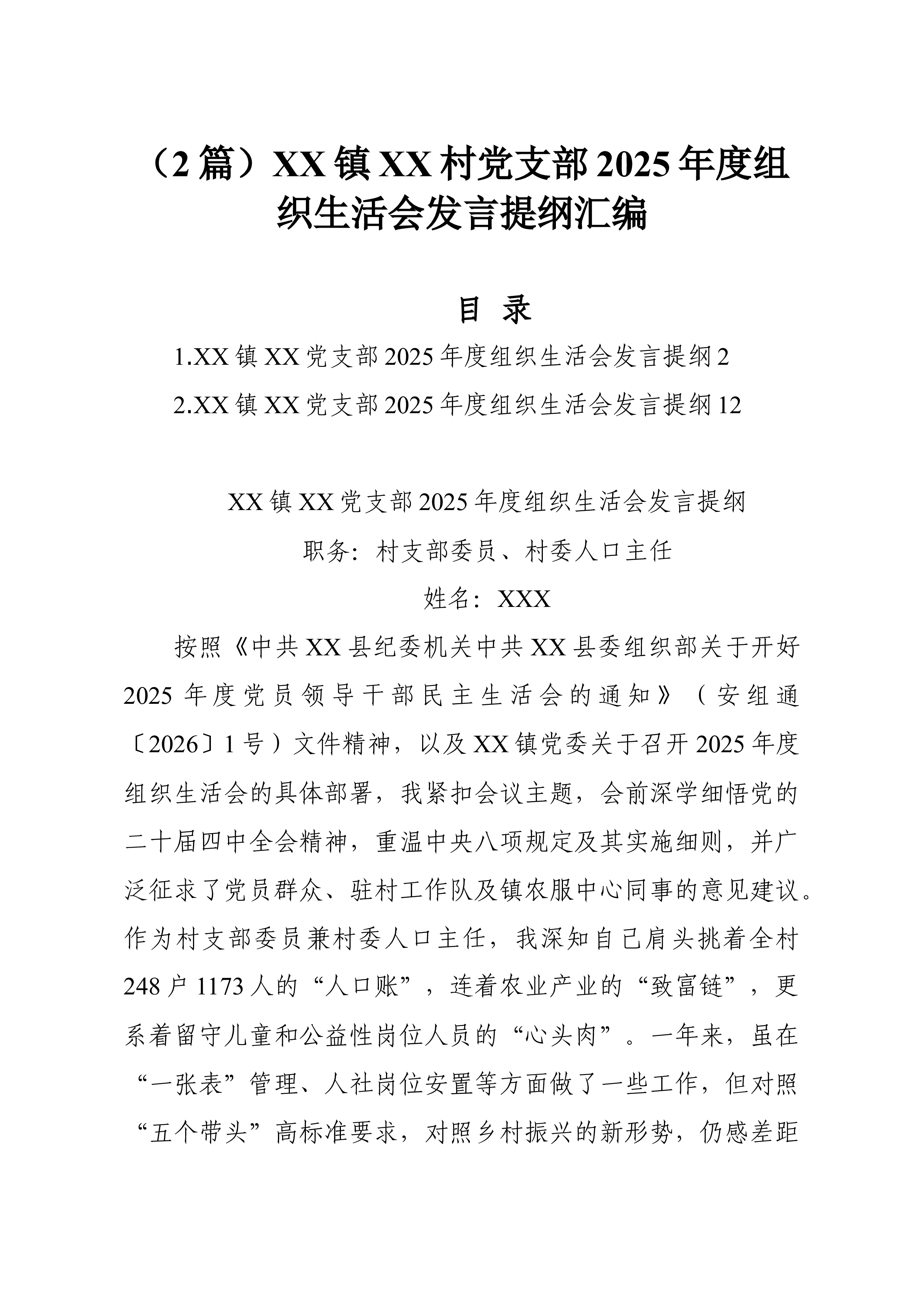 (2篇)XX镇XX村党支部2025年度组织生活会发言提纲汇编
